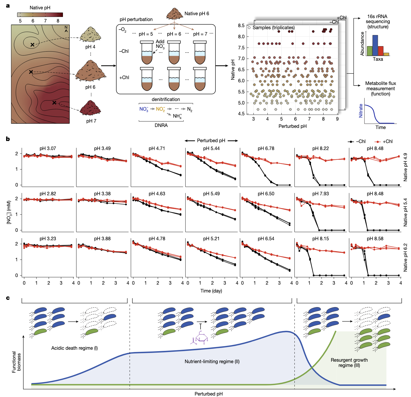 这篇文章做了大量的土壤微宇宙(microcosms)扰动实验,测量硝酸盐利用和微生物组,工作量很大。还在此基础上构建了数学模型并实验验证,为理解复杂微生物群落如何应对环境扰动提供了新视角。
