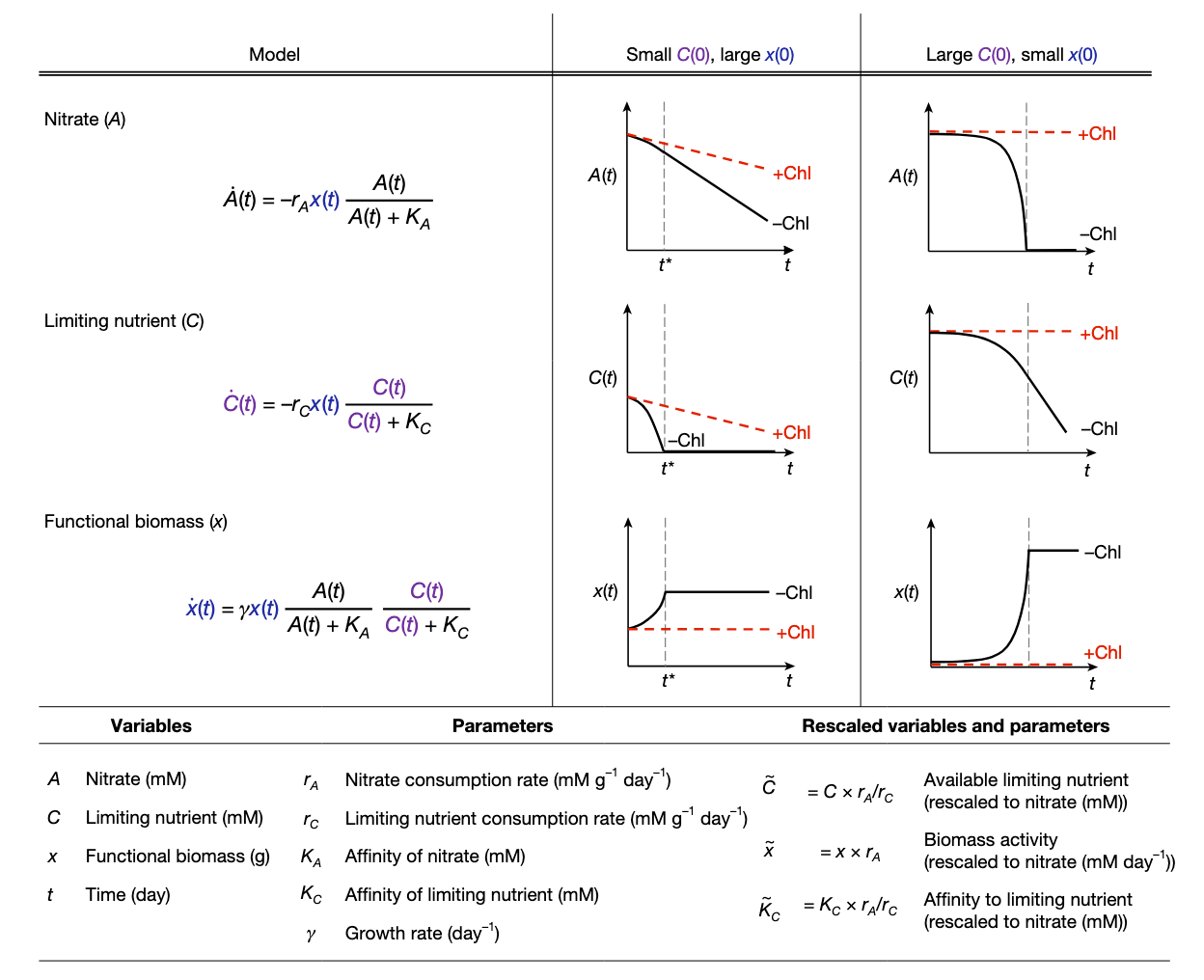 模型有两个关键特性:首先,硝酸盐利用率(Ạ)与功能生物量(x)的数量成正比,即使在没有生长的情况下也是如此;其次,功能生物量对A和C的吸收遵循共同限制的Monod形式,因此任何一种资源的耗尽都会停止生长。这些特性意味着当C耗尽时,生长停止,硝酸盐(A)以与x成正比的恒定速率被消耗。