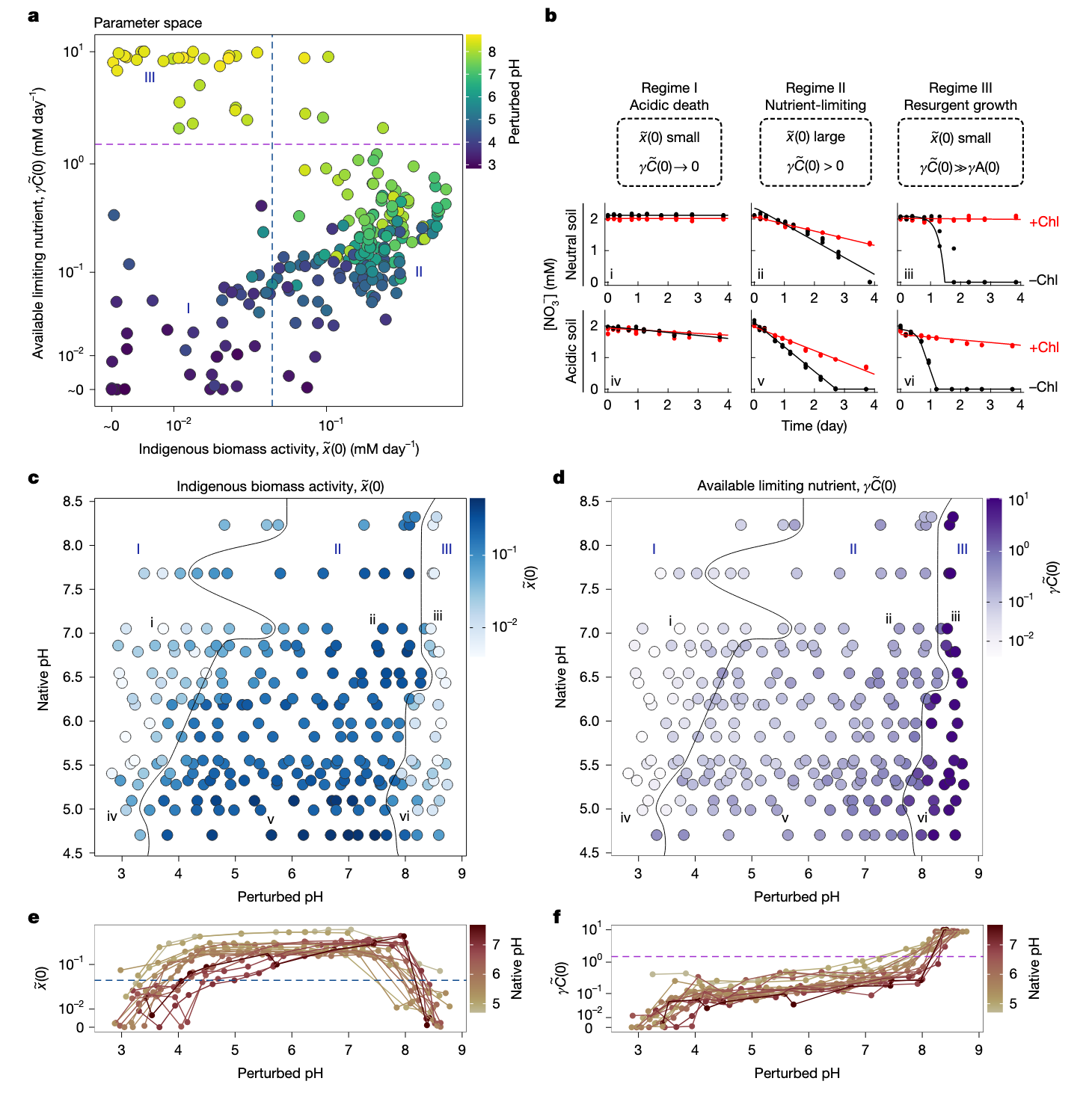 图3a展示了从所有样品的硝酸盐动态推断出的两个模型参数——土著生物量活性(x̃(0))和限制性养分浓度(γC̃(0))的散点图。图3b展示了每种机制下中性和酸性土壤的硝酸盐动态示例。图3c和3d分别展示了不同原生pH和扰动pH值下土著生物量和限制性养分的热图。