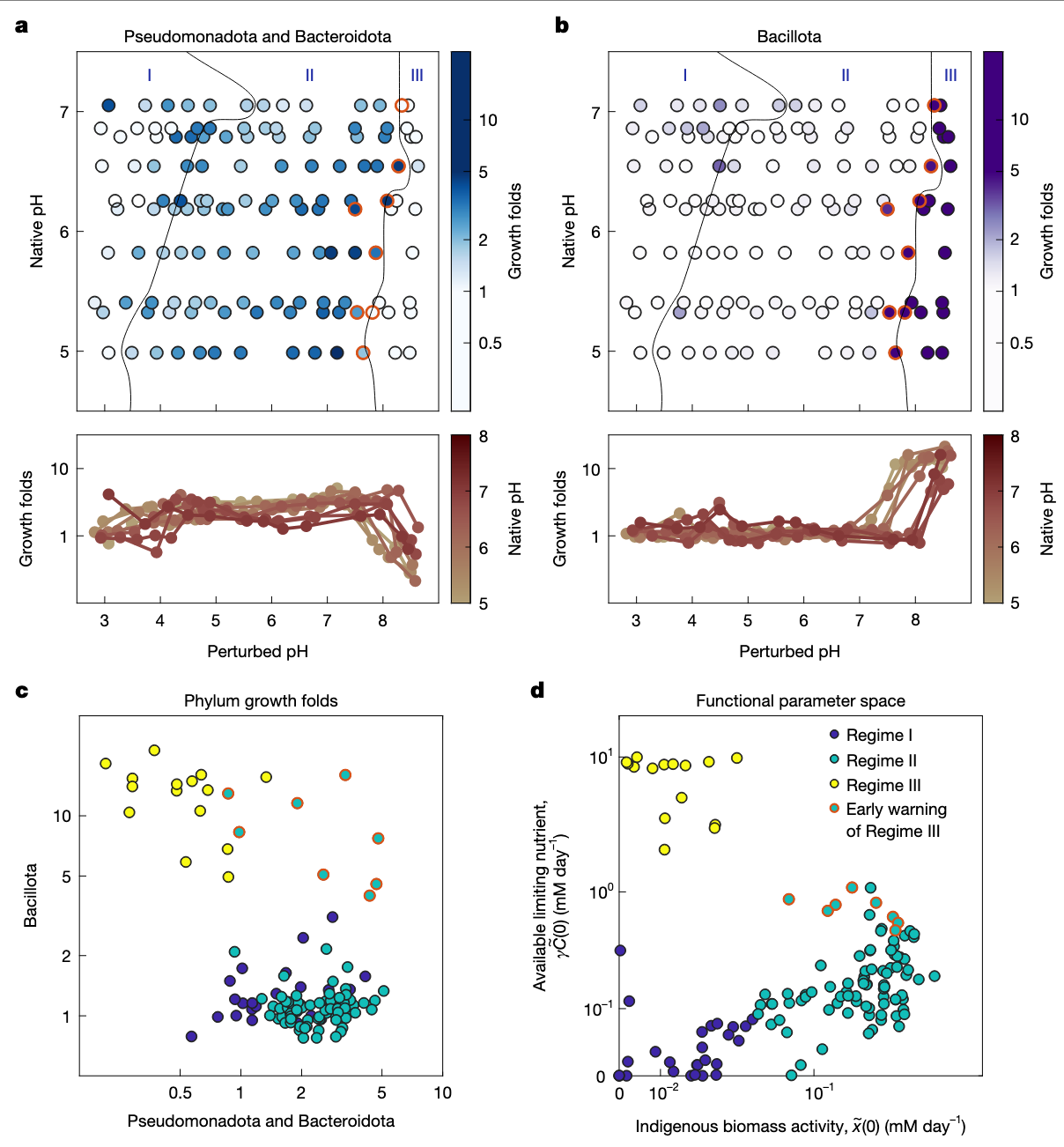 图4a和4b分别展示了假单胞菌门和拟杆菌门组合以及芽孢杆菌门在不同pH条件下的生长倍数。图4c展示了假单胞菌门和拟杆菌门与芽孢杆菌门生长倍数的散点图。图4d展示了x̃(0)与γC̃(0)的散点图,其中标出了机制,红色轮廓表示接近机制III边界的机制II条件。