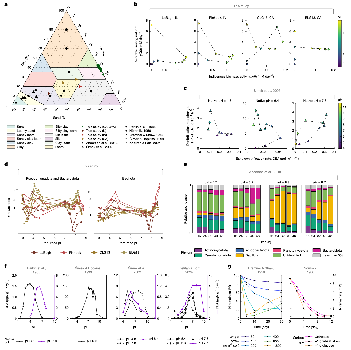 图6a展示了土壤质地(沙、粘土和淤泥的比例)的三元图。图6b展示了来自LaBagh(IL, USA)、Pinhook(IN, USA)和Sedgwick CLG13和ELG13(CA, USA)土壤样品的拟合模型参数(x̃(0)和γC̃(0))的散点图。图6c展示了来自捷克共和国三种土壤的早期反硝化速率(反硝化酶活性(DEA,等同于x̃(0)))和DEA与长期反硝化速率(反硝化潜力(DP,等同于γC̃(0)))差异的散点图。图6d展示了来自LaBagh(IL)、Pinhook(IN)和Sedgwick CLG13和ELG13(CA)土壤样品在不同pH水平下芽孢杆菌门以及假单胞菌门和拟杆菌门组合的生长倍数。图6e展示了Anderson等人研究中pH扰动后门水平相对丰度随时间变化。图6f展示了来自四项研究的土壤在酸性或碱性pH扰动下土著生物量活性(x̃(0))下降。图6g展示了先前研究中土壤在接近原生pH下氮利用的恒定速率。