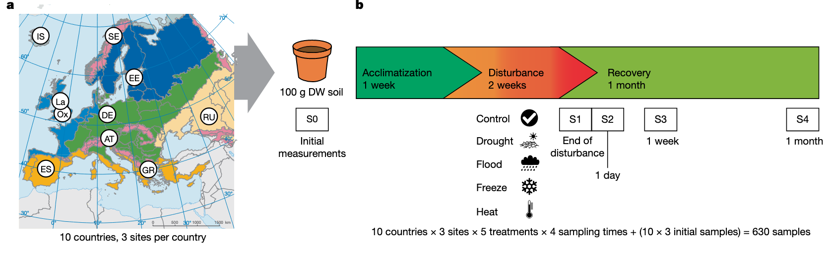 研究采集自欧洲30个草地土壤(涵盖高山、温带、地中海、寒带等气候区),每个土壤样本在实验室中分别接受五种处理:对照、干旱、洪水、冻结和高温(热浪)。处理持续时间依据生态学合理尺度设定。随后,对样品进行宏基因组测序和代谢活性检测,以揭示微生物群落的组成和功能变化。