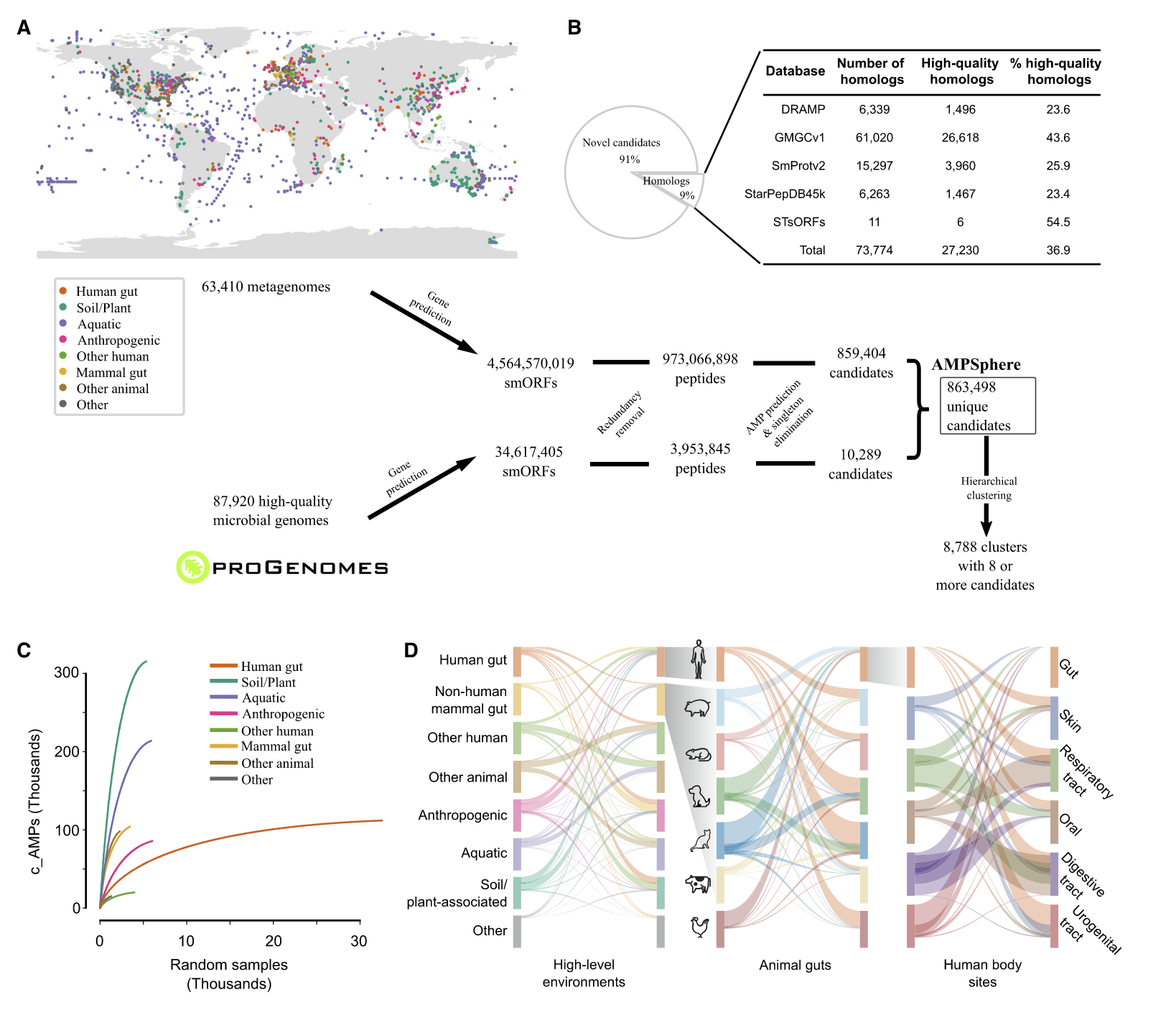 研究团队整合了全球范围内的微生物组数据,包括63,410个公开宏基因组样本(覆盖土壤、水生、人体肠道等72种生境)和87,920个高质量原核生物基因组(来自ProGenomes2数据库)。为解决smORF预测难题,采用改良版Prodigal软件(可识别30-300 bp的短序列),从宏基因组组装 contig 及原核基因组中共预测出45.99亿个smORF,为后续AMP筛选奠定数据基础。