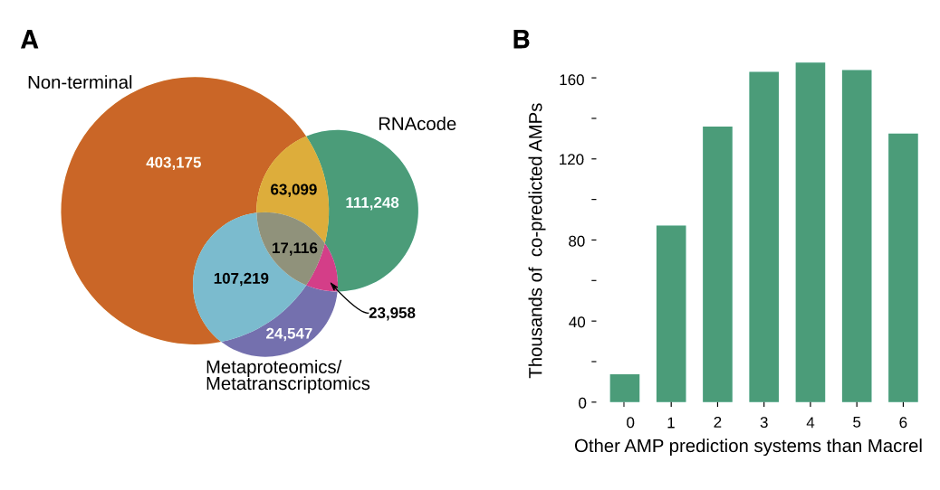 - 初筛:通过Macrel从45.99亿个smORF中筛选出551.83万个候选AMP基因;