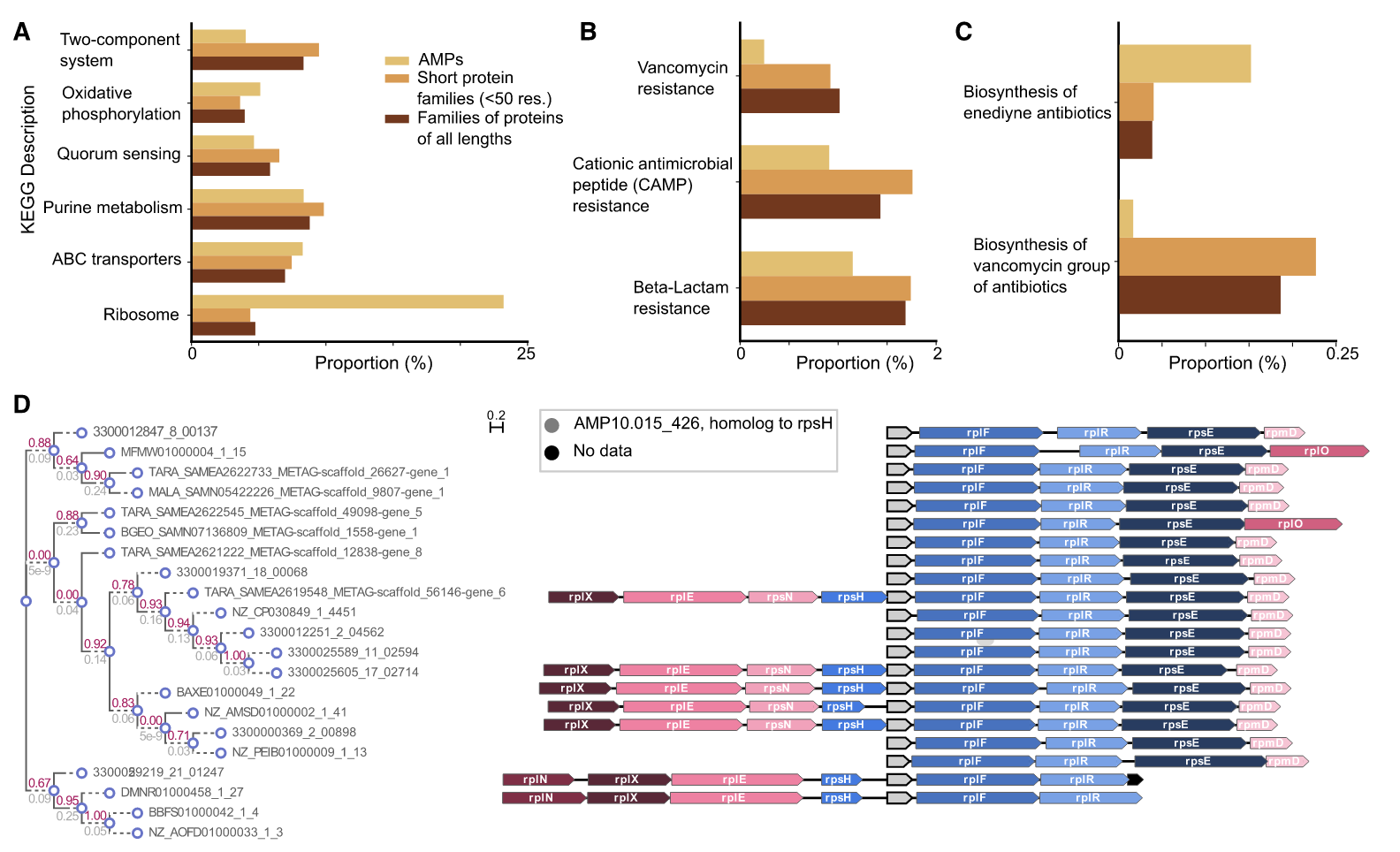 - 进化机制:约7%(61,020条)c_AMPs与全长蛋白质同源,其中27%与同源蛋白质共享起始密码子,提示可能通过全长基因早期终止突变(如无义突变导致转录提前终止)产生;此外,38.9%的c_AMPs(在不同基因组中存在≥2个同源物)与已知功能基因存在保守基因组上下文,其中23.6%与核糖体相关基因相邻,1,951条c_AMPs与邻近基因具有相同KEGG直系同源组注释,暗示基因复制可能是另一重要起源途径。