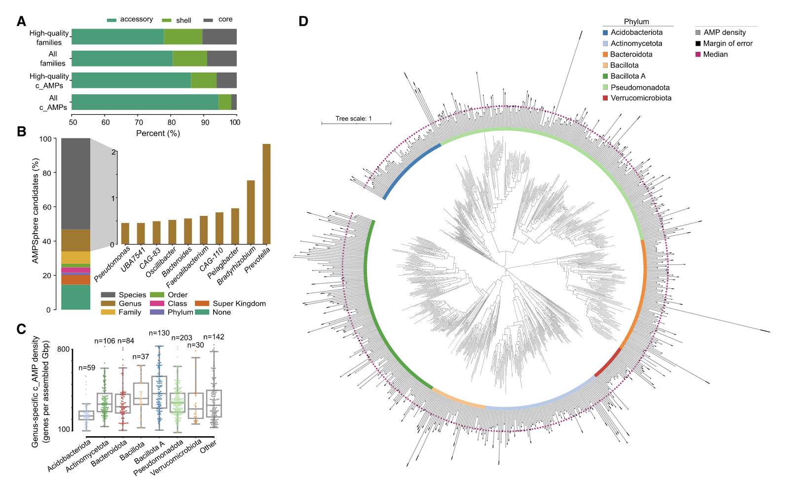 - 泛基因组定位:在ProGenomes2数据库的416个物种中,仅5.9%的c_AMPs家族属于核心基因组(存在于≥95%的物种基因组中),其余均为附属基因组成员,表明c_AMPs可能是微生物适应特定生境的“适应性分子”,而非基础生命活动必需基因。