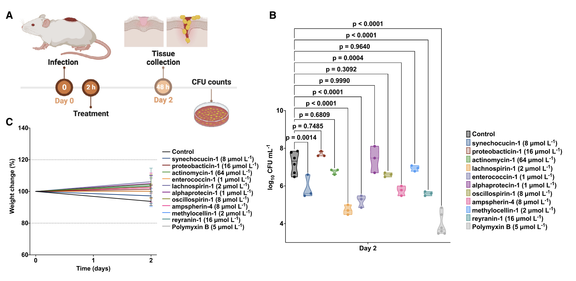 - 体外活性:100条合成c_AMPs中,79条表现出体外抑菌活性,其中63条可有效抑制至少一种ESKAPE致病菌,最小抑菌浓度(MIC)与临床常用抗生素相当(部分低至8 μg/mL);
