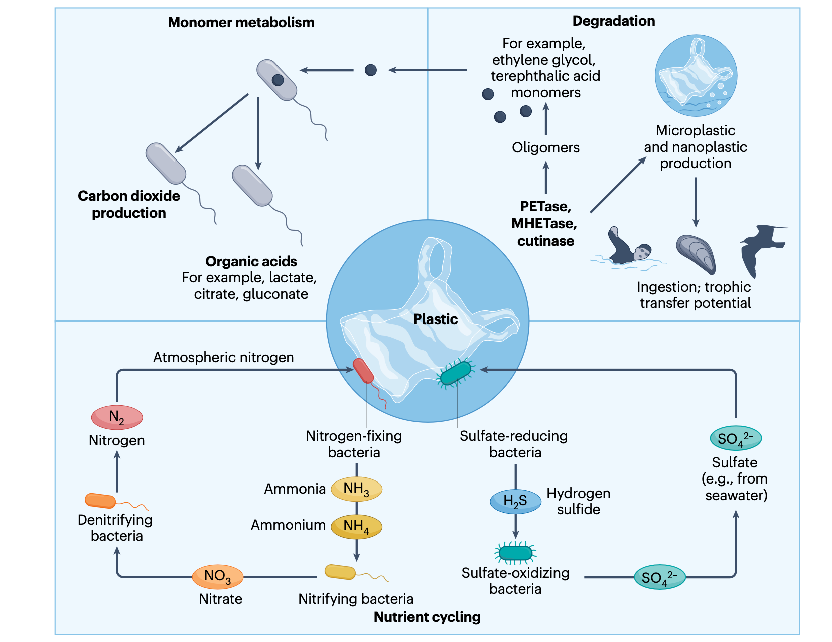 塑料际群落通过结合生物和非生物过程主动改变聚合物表面。紫外线驱动的光氧化和机械风化引入了不稳定的官能团和表面缺陷,随后可被微生物群落进一步利用。胞外聚合物的积累和真菌菌丝渗透产生的物理压力进一步增加了局部的化学转化。