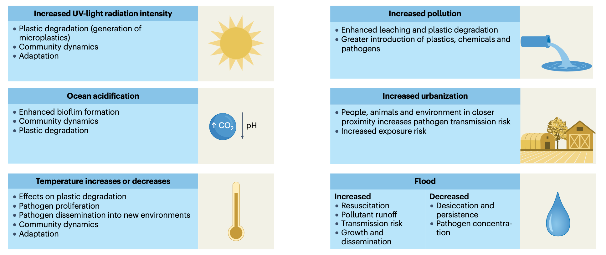 由于大气中二氧化碳吸收增加导致的海洋酸化,尽管塑料际生物膜能在一定程度上庇护微生物免受周围海水影响,但酸化仍可能通过改变聚合物表面电荷和生态电晕化学来改变定殖动态。日益严重的污染和更高水平的城市化(这迫使人类、动物和环境更紧密地接近),进一步促进了病原体从塑料际传播的能力,并增加了人类暴露于塑料衍生化学物质和浸出物的可能性。随着塑料际内的微生物群落适应和响应气候变化而进化,它们在营养循环、污染物降解和病原体动态中的作用可能会发生重大改变。塑料表面易浸出的添加剂引入了额外的化学压力源,可以扰乱微生物群落,并与金属和杀菌剂等共存污染物相结合,可能产生与抗生素抗性相关的选择压力。最后,洪水等环境极端事件将增加污染物径流和微生物复苏,而干旱则可能将塑料际内的持久性病原体浓度提高。因此,塑料际可能正成为一个汇聚点,在这里,气候驱动的塑料降解与抗生素抗性相互交织。除了这些公共健康风险,塑料际也促进了气候强迫:塑料聚合物的微生物分解会产生挥发性有机化合物,并可以促进沉积物中富集的硝化细菌和反硝化细菌产生局部的一氧化二氮。因此,气候引起的温度和pH值变化对塑料的影响将进一步削弱其生态系统服务功能,并加剧环境污染。