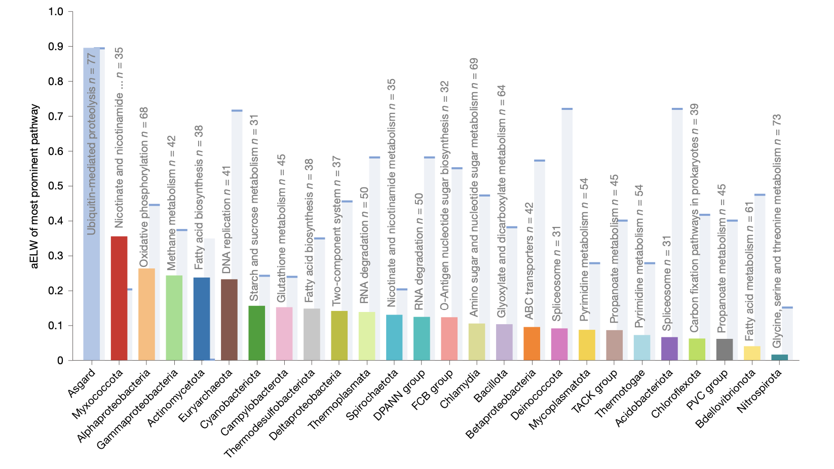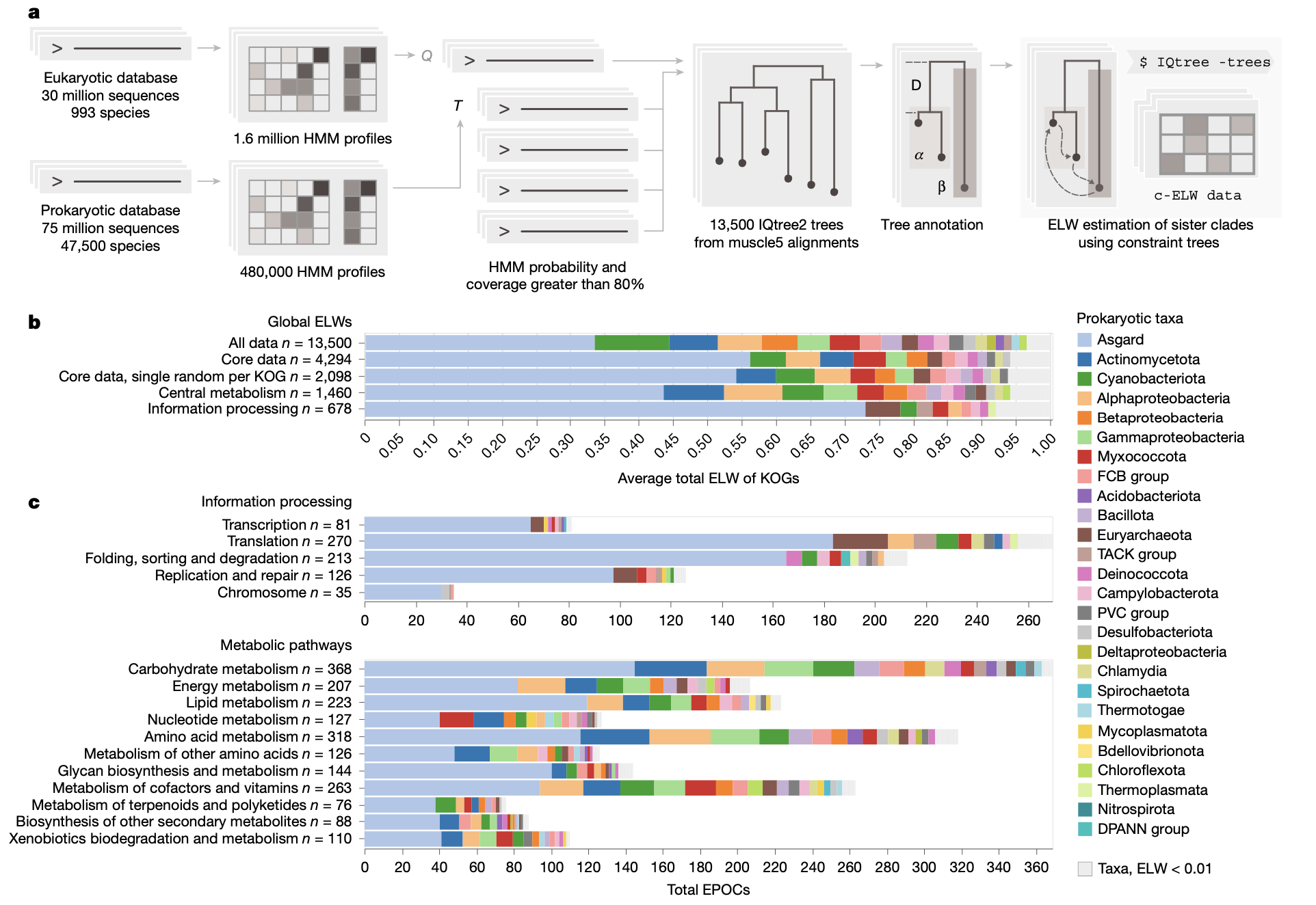 为了推断每个EPOC中数据所支持的真核生物蛋白质最可能的原核生物祖先,研究人员没有直接依赖系统发育树拓扑结构,而是使用了一种基于约束树的进化假设检验的概率方法。在构建初始主树之后,进行了进一步的约束树计算,详尽抽样最接近真核生物分支的所有原核生物姐妹支系的排列,并获得一组可能的姐妹支系模型的预期似然权重(ELW)。鉴于ELW度量类似于模型选择置信度,此处将其视为抽样原核生物支系是真核生物支系最近姐妹支系最佳估计的概率比例。对于每个EPOC,该分析动态地考虑了长支异常值,并且能够解析真核生物并系,将EPOC内每个已解析的真核生物支系单独处理以进行下游分析。最终数据包括使用KEGG直系同源群(KOG)生成的谱图注释的13,500个EPOC,每个EPOC均包含使用muscle5生成的MSA、使用IQtree2推断的最大似然树以及所有候选原核生物姐妹支系的关联ELW值。原核生物祖先分析仅针对那些包含多于五个不同分类学标签(至少一个来自Amorphea,一个来自Diaphoretickes——这两个庞大的真核生物支系被认为源自真核生物进化中的第一次或第二次分化)的真核生物支系进行。因此,虽然未尝试明确重建LECA基因集,但这些支系代表的基因,鉴于其广泛的分类学分布,很可能在LECA中已有祖先。