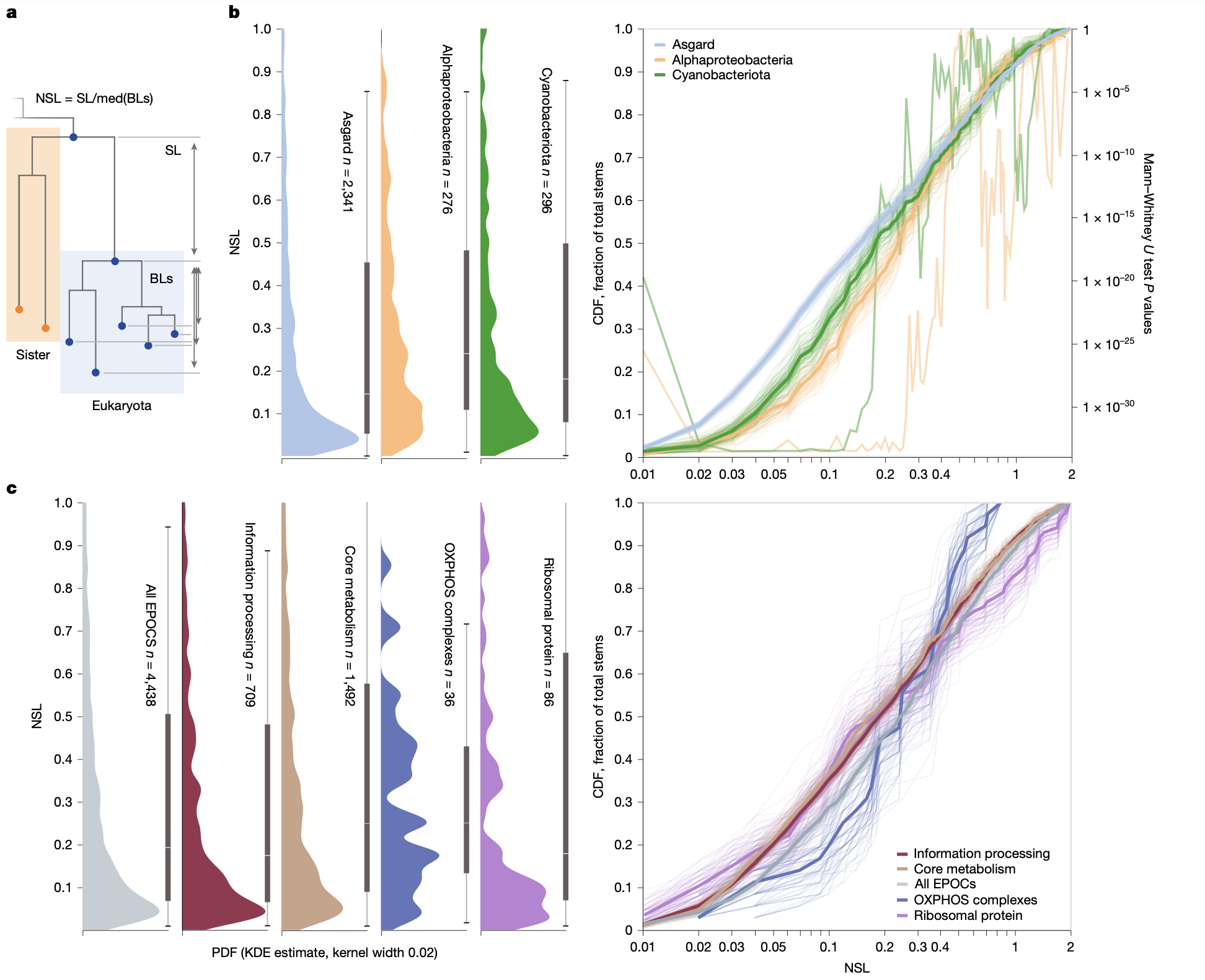 在整个数据集的真核生物茎干长度集合(5850个茎干)中,研究人员观察到一个广泛的分布,其尖锐的最大值接近0.05,高度 reminiscent of previous findings。在分析中,短于0.3的α-变形菌茎干(占所有茎干的70%)显著长于阿斯加德起源的茎干,但长于0.35的α-变形菌茎干反而平均短于阿斯加德茎干,显示出一种不明显但可重复且具有统计学意义的关系。蓝藻菌起源的茎干遵循类似但较弱的趋势。因此,尽管α-变形菌来源基因具有全局较短茎干长度的观察仅适用于长于0.35的茎干,但研究人员有效地重现了Pittis和Gabaldon的发现,他们主要分析了该范围内的茎干。当研究人员将分析限制在核糖体蛋白和氧化磷酸化复合体的组件上,即分别具有众所周知且易于识别的古菌和α-变形菌祖先的基因时,上述趋势得到进一步强化。与将茎干长度作为获取时间度量的概念相反,研究人员观察到假定在线粒体共生发生期间同时获取的氧化磷酸化复合体的归一化茎干长度存在超过两个数量级的方差。总之,这些发现表明,即使归一化的茎干长度也主要由基因获取时间以外的因素决定,至少在此处分析的漫长进化时间尺度上是如此。