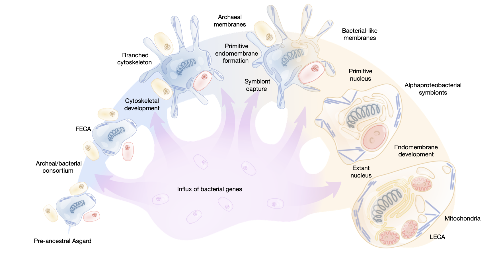 真核细胞的起源是进化生物学的关键问题之一。研究证实,最后一个真核生物共同祖先(LECA)已经拥有线粒体——一种源自α-变形菌的内共生细胞器,而阿斯加德古菌(目前归类为Promethearchaeota门)的发现则为了解真核生物的演化提供了重要线索。