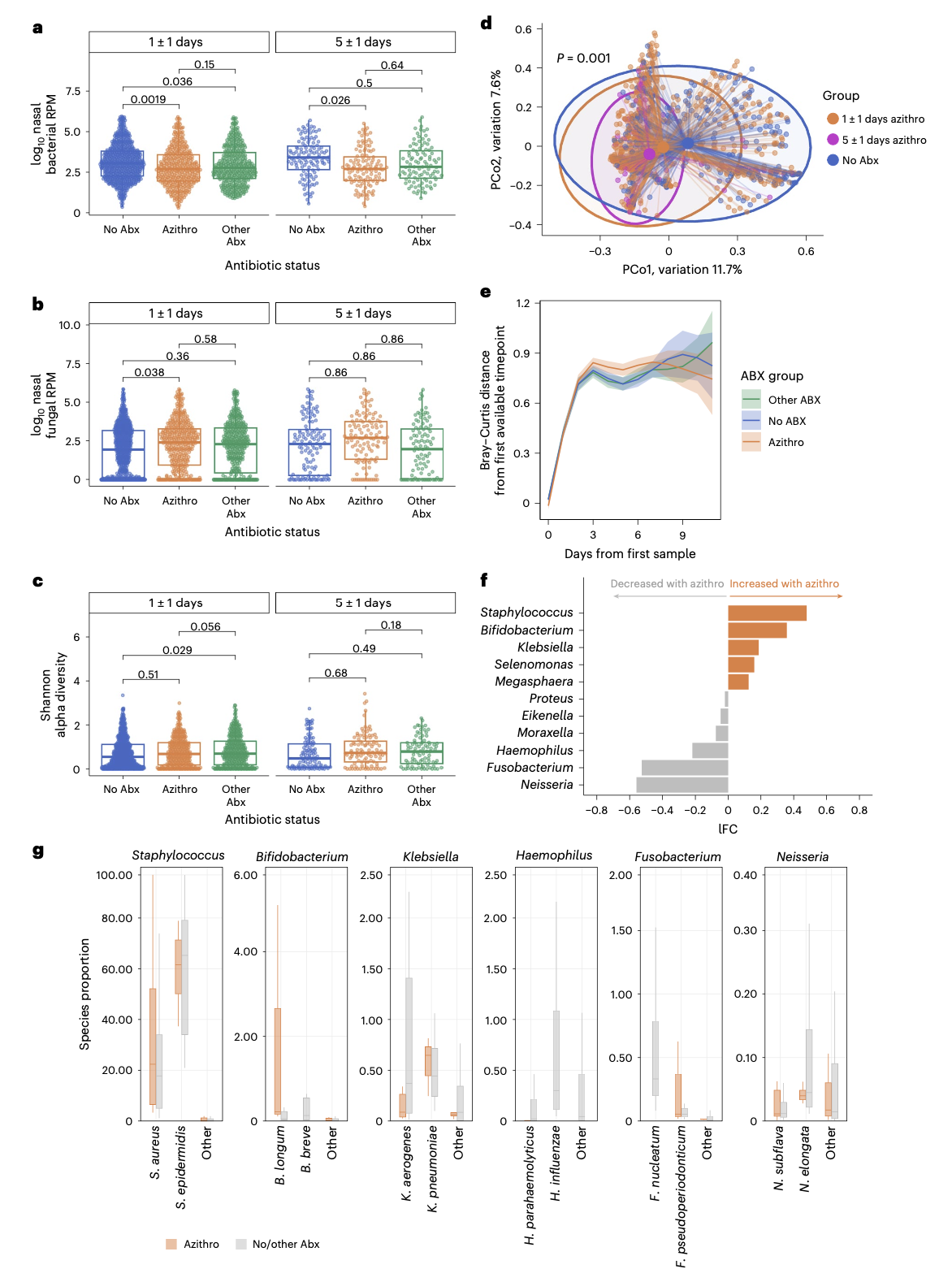 分析显示,暴露于阿奇霉素约5天后,与对照组相比,患者上呼吸道细菌相对丰度显著降低。用药1天后即可观察到类似趋势。同时,阿奇霉素暴露与上呼吸道真菌相对丰度的增加相关。尽管微生物组的α多样性未受影响,但其群落组成在阿奇霉素暴露后发生了显著改变。
