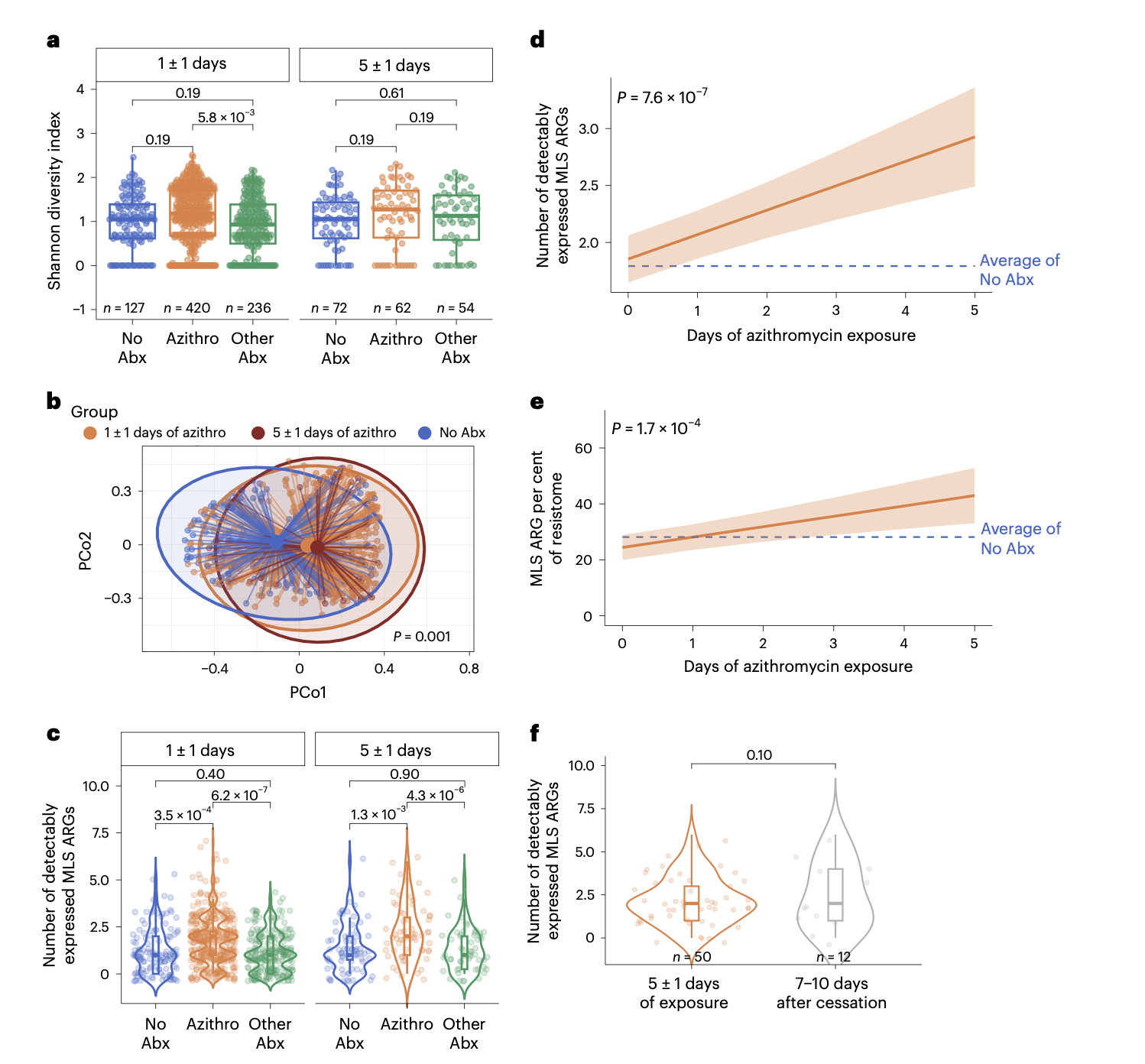 研究重点聚焦于介导MLS类耐药的基因。研究发现,在治疗早期和晚期,阿奇霉素暴露组中可检测到的MLS基因数量均显著多于无抗生素组或其他抗生素组。纵向模型分析证实,阿奇霉素暴露天数与上呼吸道微生物组中可检测到的MLS耐药基因数量的增加显著相关。