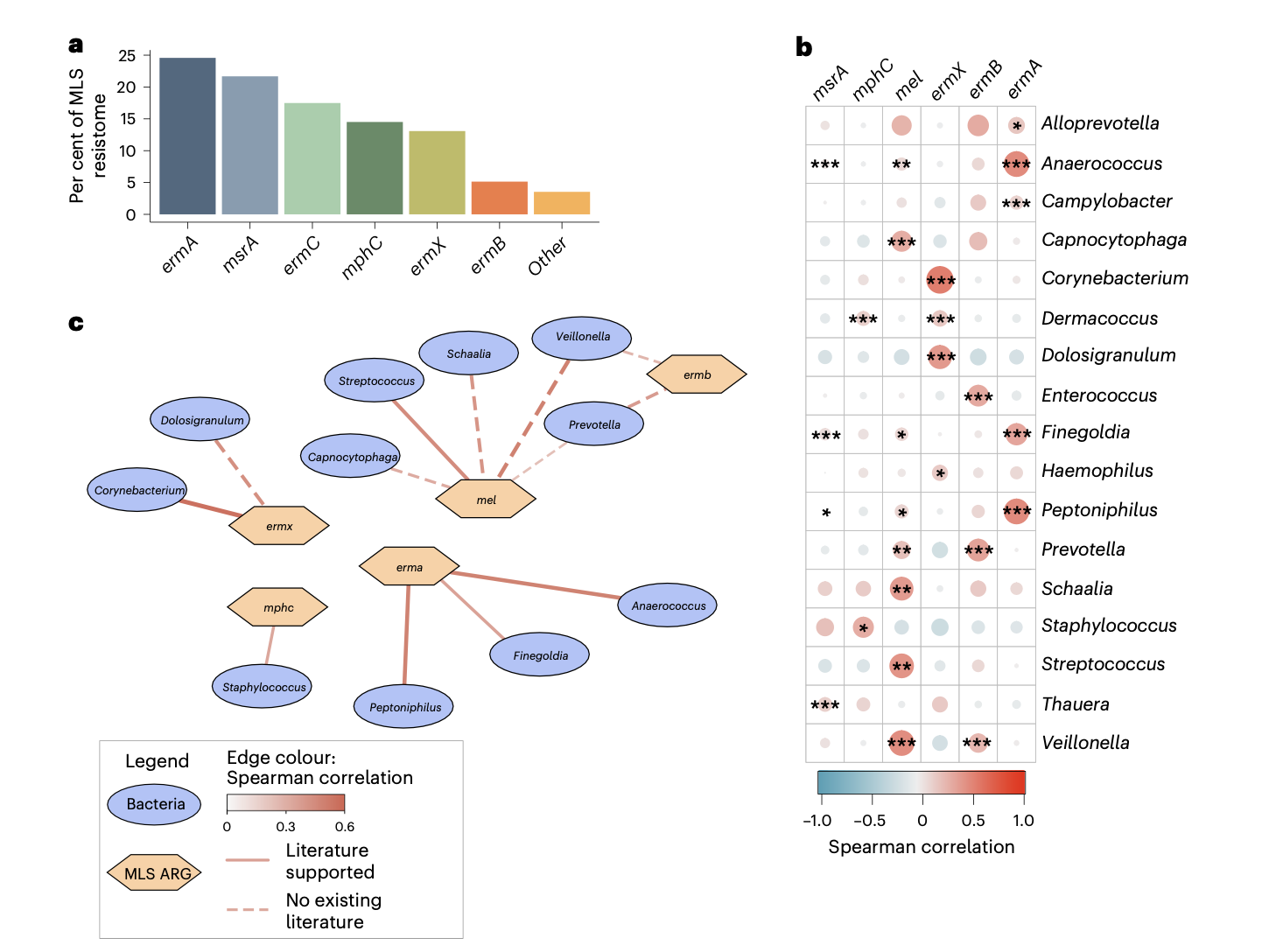 研究人员鉴定了气道微生物组中的多种MLS耐药基因,其中以 ermA 和 msrA 最为普遍。多维相关性分析显示,多个MLS基因与潜在致病菌和常见共生菌的丰度呈显著正相关。物种水平的分析进一步强化了这些关联。利用CARD数据库的病原体来源预测工具进行的补充分析,也强调了MLS耐药基因与特定物种(如化脓性链球菌与 ermA,金黄色葡萄球菌/表皮葡萄球菌与 ermC)之间的关联。