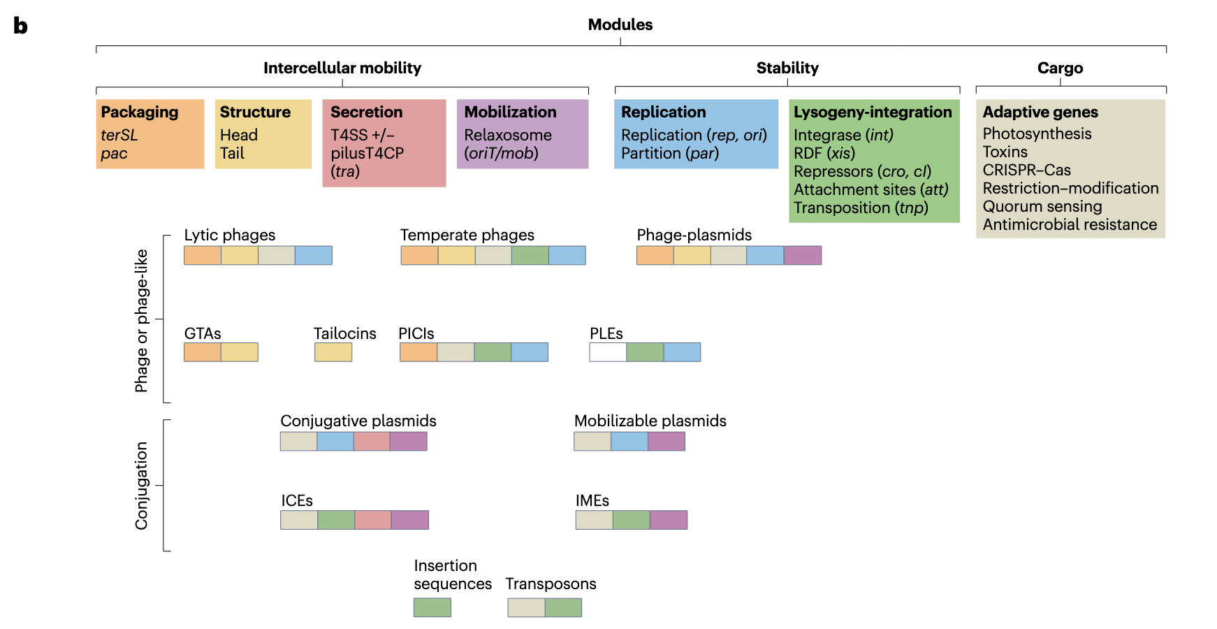 基因模块(指编码特定功能的基因簇,如接合转移模块、DNA包装模块)的共享与交换是MGEs进化的核心机制之一。不同类别MGEs常携带同源的功能模块,例如噬菌体与GTAs共享DNA包装及尾部结构基因,ICEs与接合型质粒共享接合转移模块,这些同源模块的序列相似性提示其可能源于共同祖先或通过水平转移实现交换。