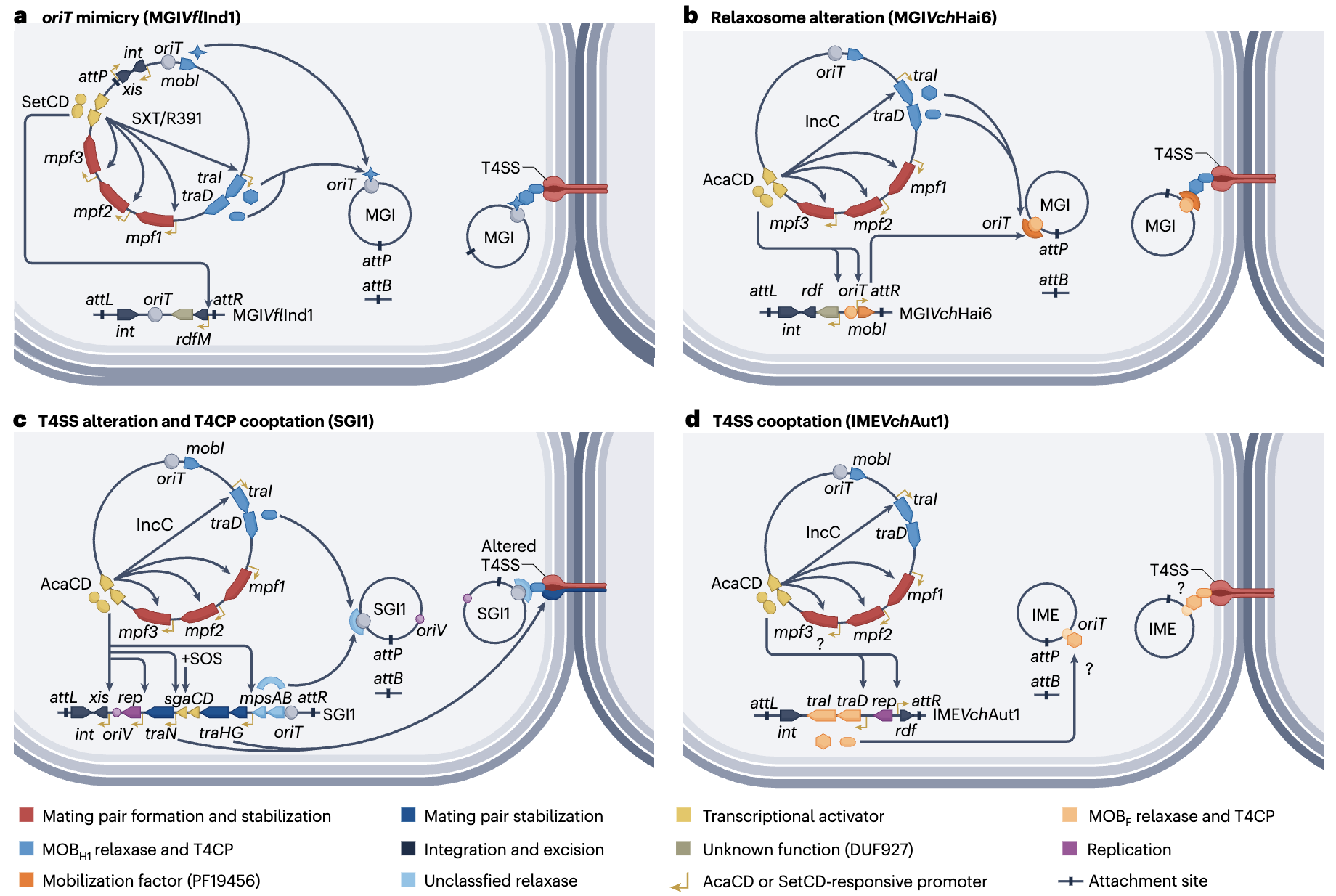 | Integrative and mobilizable elements (IMEs) | 整合–可动元件 | 与 ICE 相似但缺乏完整的接合系统。需依赖共轭元件(如共轭质粒或 ICE)的装置传播。 | 通过“劫持”辅助元件的接合系统传播,不同 IME 采用多种独特机制,因此识别较为困难。 |