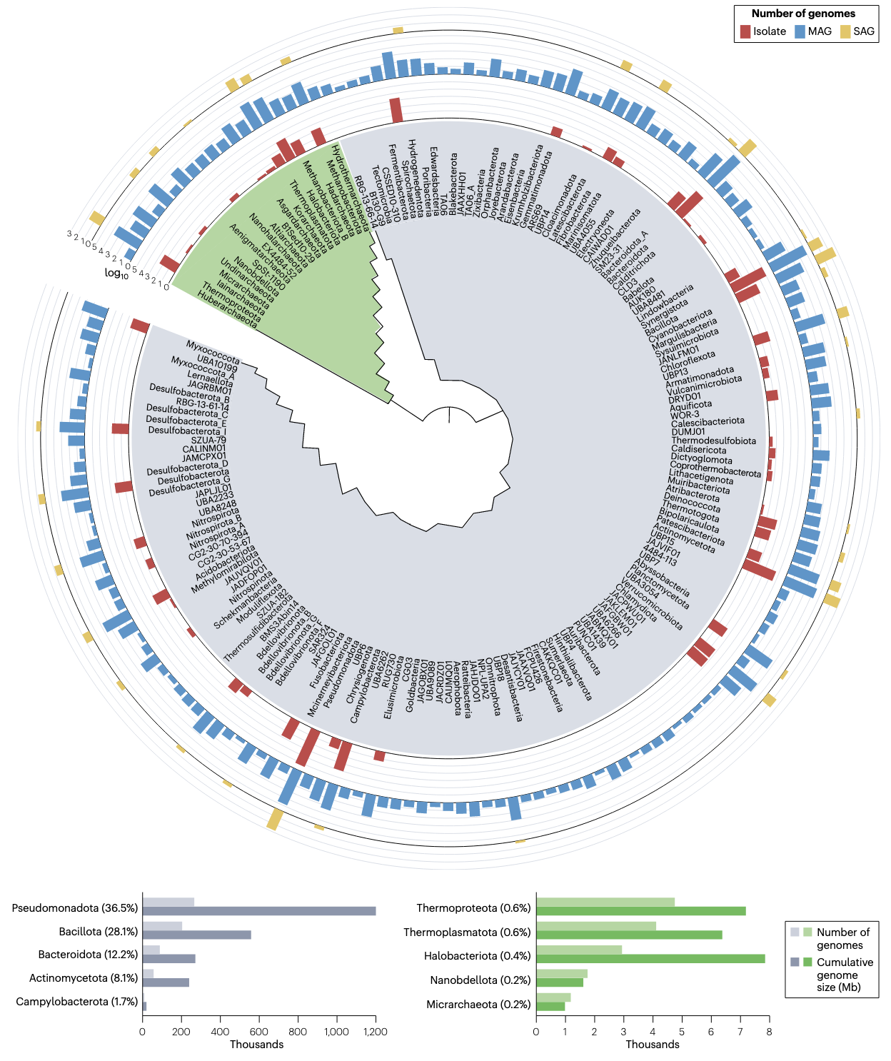 - 生命树的重构:传统的生命树构建主要基于核糖体RNA基因序列,而基因组中心方法通过利用全基因组数据,能够更准确地反映微生物之间的进化关系。2016年,Hug等人基于基因组数据构建了新的生命树,对传统的生命树结构进行了重大修正,揭示了许多新的微生物分支。2021年,Coleman等人通过对大量细菌基因组的分析,构建了一个有根的细菌进化树,为理解细菌的早期进化提供了关键线索。