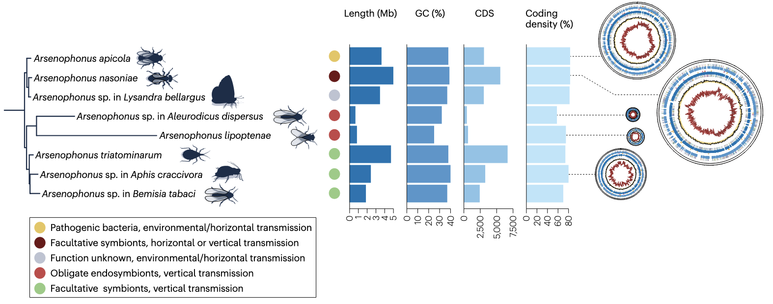 - 昆虫共生微生物:昆虫与共生微生物之间存在密切的共生关系,共生微生物对昆虫的生存、繁殖和适应环境具有重要作用。2023年,Dharamshi等人研究发现基因获得促进了衣原体的内共生进化,衣原体通过获取宿主或其他微生物的基因,逐渐适应内共生生活方式。2016年,Manzano-Marín等人研究了蚜虫共生菌Serratia symbiotica的基因组缩减过程,发现该共生菌在与蚜虫长期共生过程中,逐渐丢失了大量非必需基因,基因组大小不断缩减,以适应宿主内的生存环境。2020年,Bourguignon等人发现原核生物的基因组缩减与突变率增加相关,这一发现为理解昆虫共生微生物的基因组进化机制提供了新的视角。