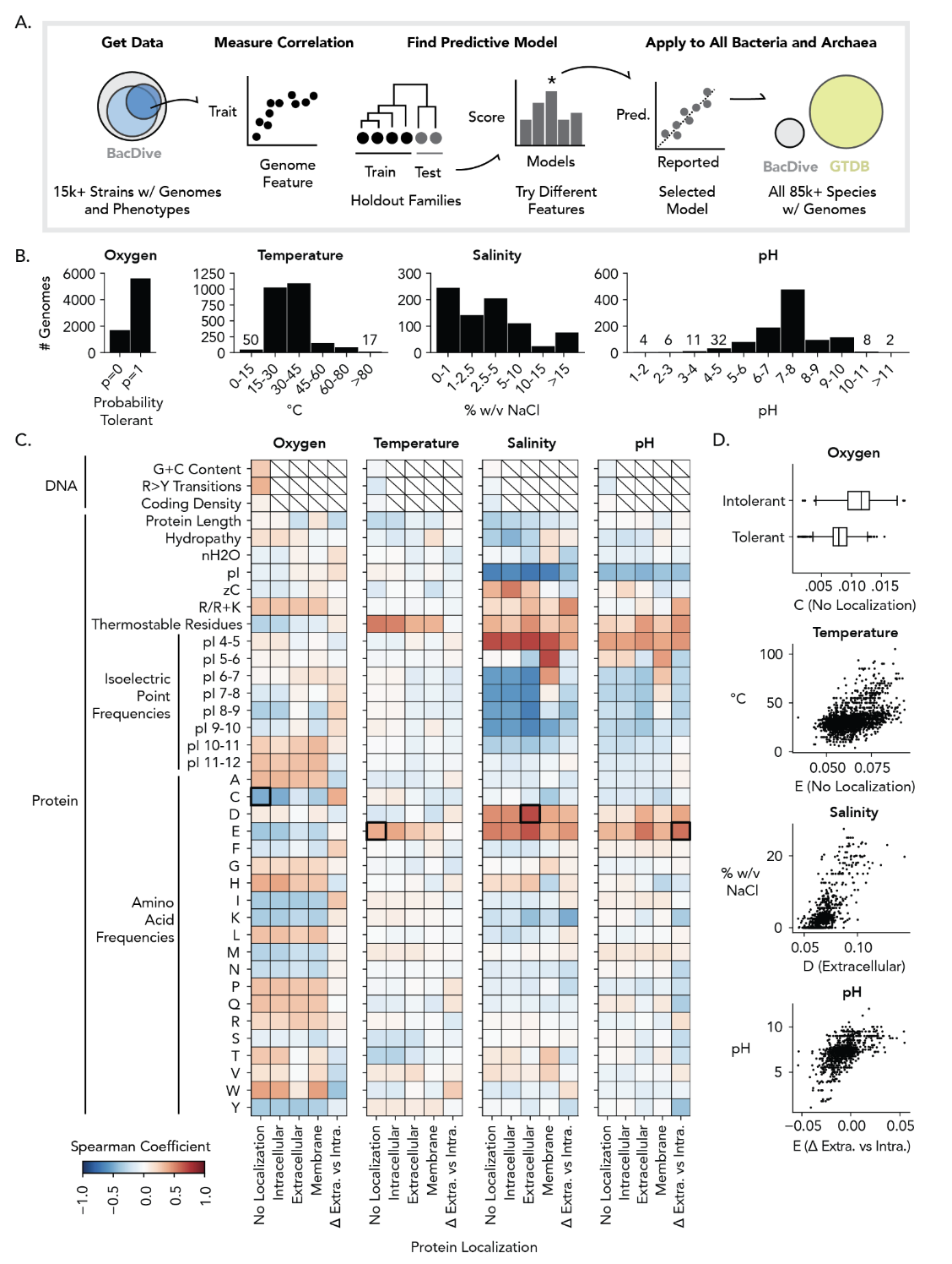 总体方法思路是:从已知可以培养的、具有生长条件注释(氧、温度、pH、盐度等)的微生物样本出发,建立统计/机器学习模型,用氨基酸组成作为特征,预测这些生长条件。然后将模型推广到未知或未培养的微生物或从环境样本中拼装出的基因组(metagenome-assembled genomes, MAGs)。