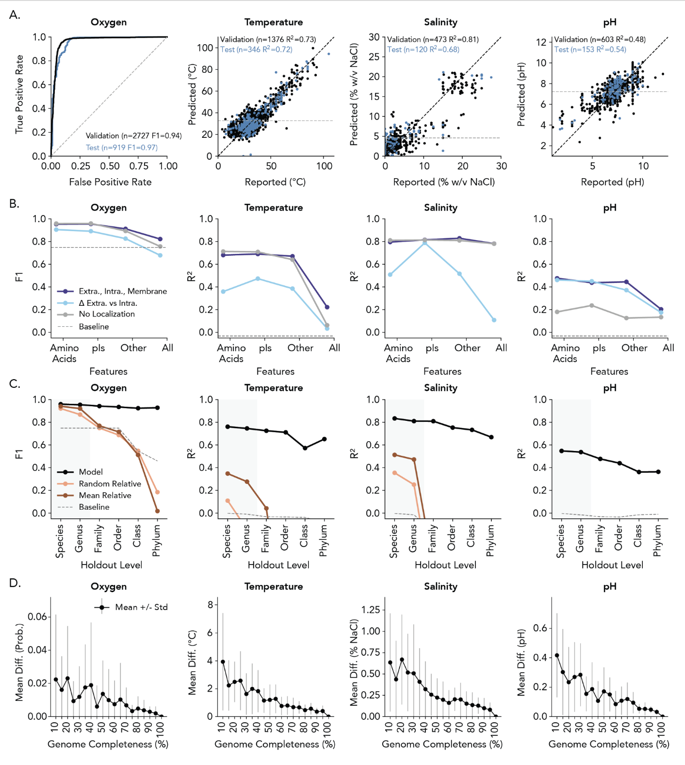 模型训练与交叉验证 使用监督机器学习方法(例如分类模型或回归模型,视目标变量而定),将氨基酸频率作为输入特征,预测氧气耐性(分类)、最适温度(回归)、最适 pH(回归)、盐度(回归)。 在模型训练过程中,作者采取交叉验证或留出验证集来评估模型性能。 此外,他们还评估在不同基因组完整度(如只用了 10% 的基因组片段)情况下,模型的稳健性。