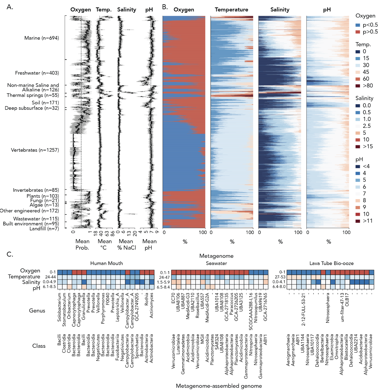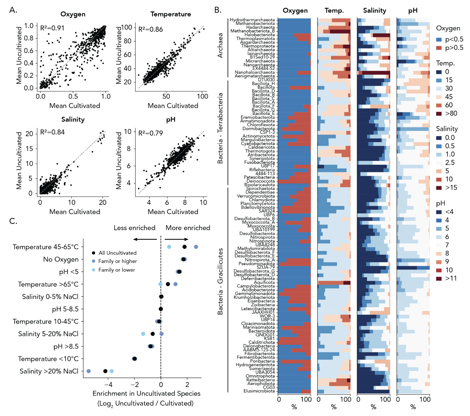 - 作者将模型推广到 85,205 个已有基因组物种(包括未培养的物种),预测其氧气耐性、最适温度、pH、盐度等。其结果显示,未培养物种(与已培养物种相比)在预测上更倾向于高温嗜好、厌氧性、酸性等极端条件(即未培养物种可能适应更极端环境)。