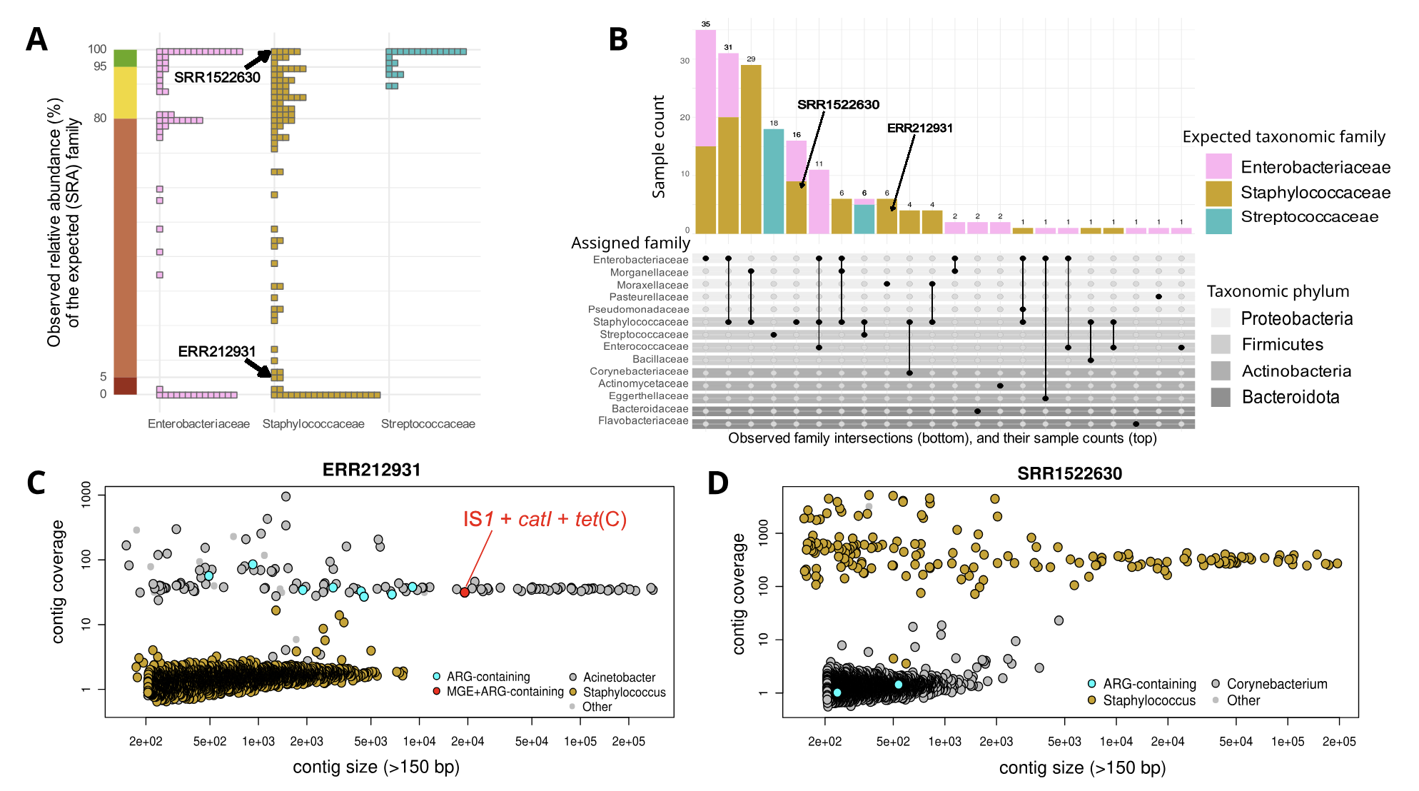 分析显示,Ellabaan研究中用于确认新ARG传播的SRA数据集存在严重污染问题。在62个预期为肠杆菌科的样本中,41个(67%)被污染;97个葡萄球菌科样本中,88个(91%)被污染;23个链球菌科样本中,5个(22%)被污染。