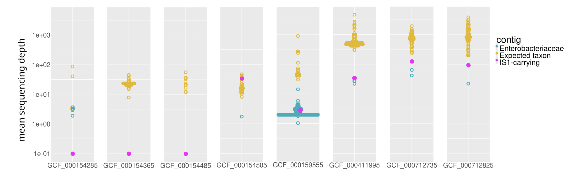 研究人员重点分析了IS1元件,该元件在原始研究中是预测变形菌门ARG跨门传播的主要贡献者。IS1在19个非变形菌门基因组中被检测到,其中仅4个显示明确的元件整合证据。对其余8个基因组的分析发现,IS1携带重叠群的测序深度持续低于预期物种范围,其中4个还检测到深度与IS1重叠群相似的肠杆菌科重叠群。这些观察结果与在污染SRA运行中的发现一致,表明检测到的IS1拷贝极不可能属于被测序物种。