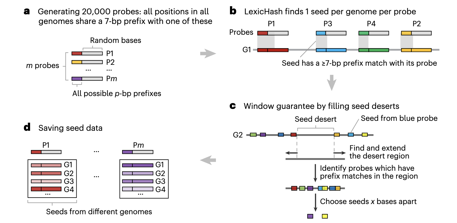 LexicMap改进了序列草图工具LexicHash,通过生成2万个31-mer“探针”(probe)覆盖所有可能的7-mer前缀——这意味着数据库中每个基因组的任意250-bp窗口,都会包含至少2个(实际中位数为5个)与探针前缀匹配的k-mer(称为“种子”)。这种设计确保了种子在基因组上的均匀分布,避免了传统工具中“种子荒漠”(seed desert)导致的比对缺失问题。