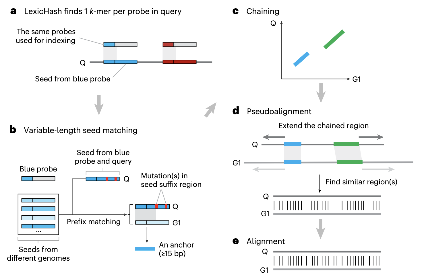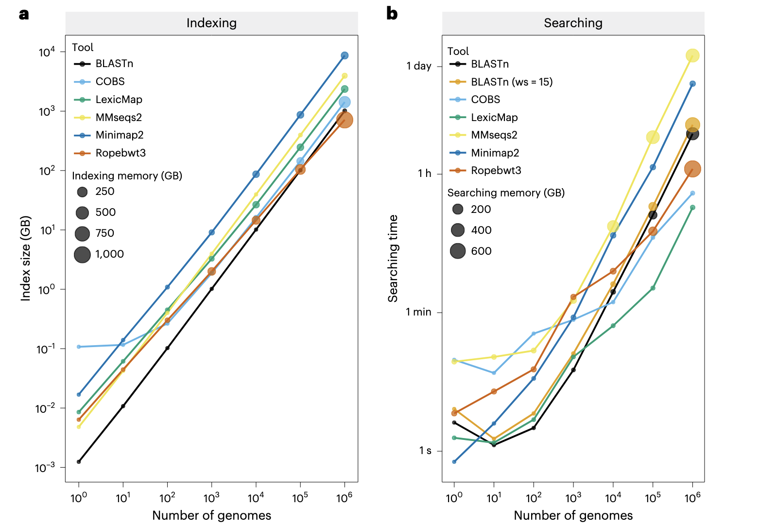发表于《Nature Biotechnology》的这项研究,针对大规模基因组比对的核心痛点,设计了一套兼顾速度、内存与准确性的解决方案。研究团队通过优化序列草图生成、种子匹配与索引构建流程,开发出LexicMap工具,并在多个百万级基因组数据集上验证了其性能优势。