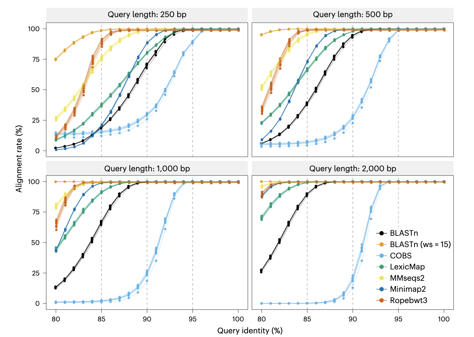 - 中低相似度序列(80%-93%):对于250bp短序列,LexicMap在88%相似度以下的比对率超过Minimap2,在93%相似度以下超过默认参数的BLASTn(word size=28);