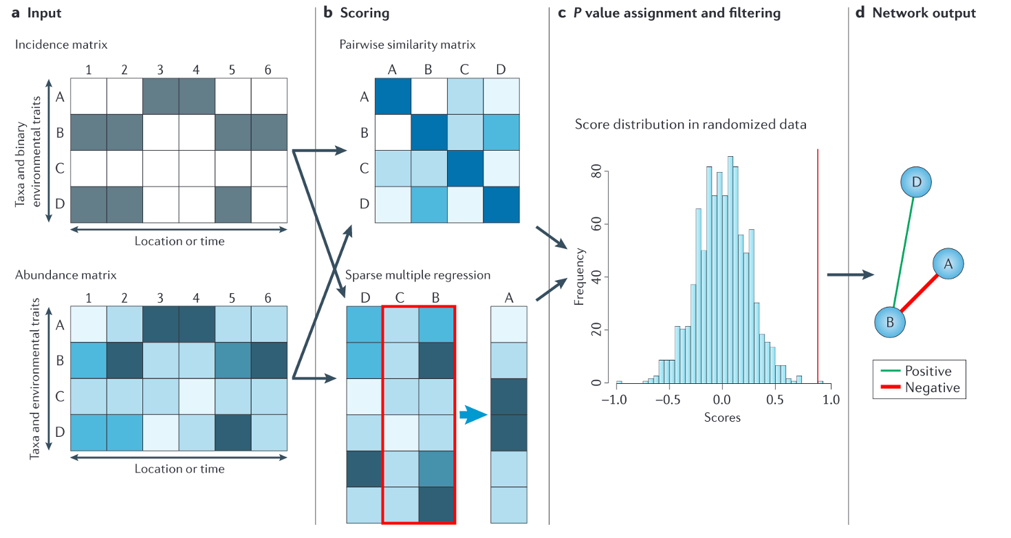 成对关系是网络构建的基础。由于实验数据通常相对稀少,我们主要依赖统计推断来确定成对关系,当然如果你已经有确定的关系了就可以跳过这一部分直接去构建网络即可。目前主要有两种统计方式: