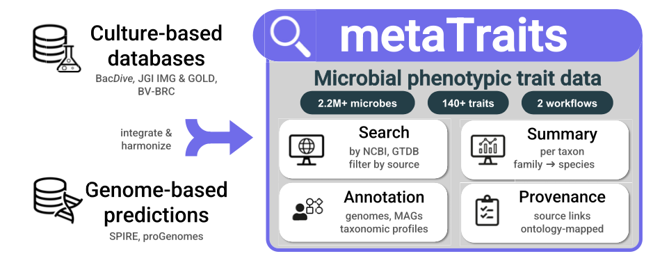 - Daniel Podlesny, Chan Yeong Kim, Shahriyar Mahdi Robbani, Christian Schudoma, Anthony Fullam, Lorenz C Reimer, Julia Koblitz, Isabel Schober, Anandhi Iyappan, Thea Van Rossum, Jonas Schiller, Anastasia Grekova, Michael Kuhn, Peer Bork, metaTraits: a large-scale integration of microbial phenotypic trait information, Nucleic Acids Research, Volume 54, Issue D1, 6 January 2026, Pages D835–D841, https://doi.org/10.1093/nar/gkaf1241