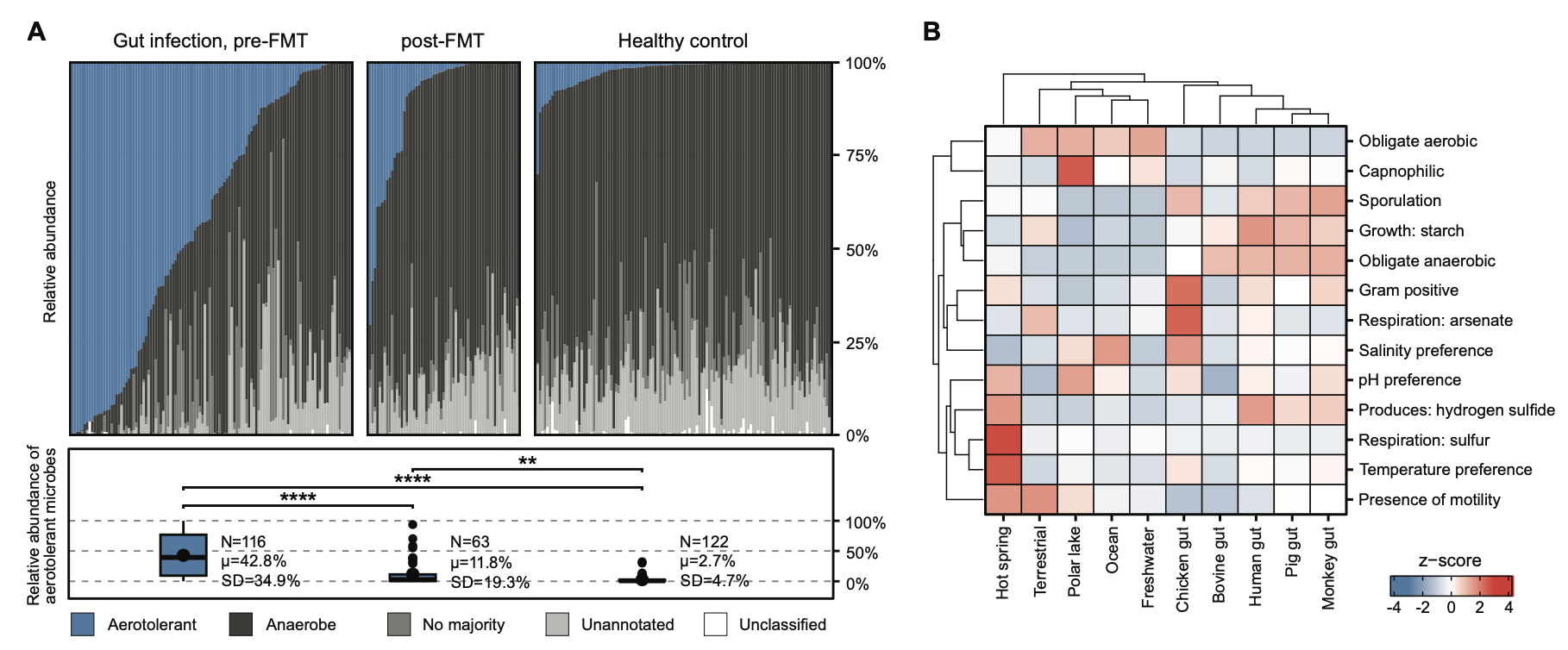 - 群落性状注释:通过注释微生物群落的性状分布,揭示环境或健康状态下的功能差异。例如,艰难梭菌感染患者肠道微生物组中需氧微生物比例显著升高,而在粪便移植后恢复至接近健康状态。