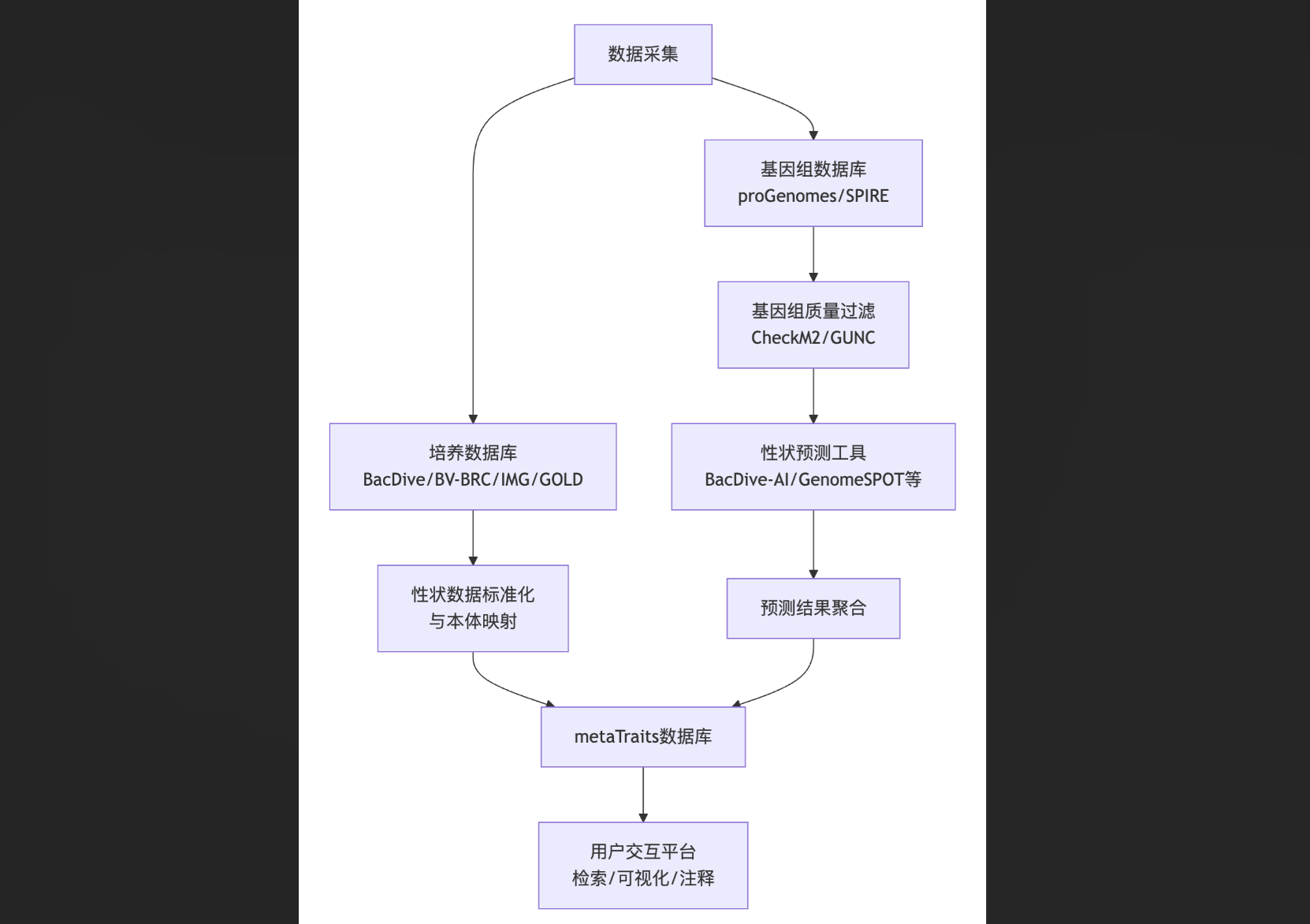现有主流性状数据库(如BacDive、BV-BRC、JGI IMG和GOLD)在数据模型和标准化方面存在差异,导致跨资源整合困难。此外,绝大多数原核生物多样性尚未被培养,现有数据库难以覆盖此类微生物。虽然计算预测方法(如BacDive-AI、GenomeSPOT等)能够从基因组序列推断性状,但尚未有资源系统性地整合培养来源的性状数据与基因组预测结果。metaTraits应运而生,旨在通过整合多源数据与预测工具,构建一个覆盖全面、标准统一的微生物性状数据库。