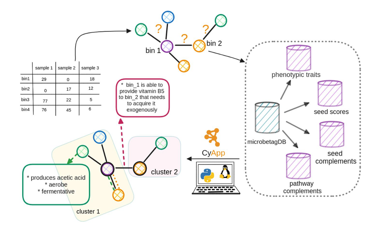 本文介绍的 microbetag 是一个用于微生物网络注释的软件生态系统。它整合了多种信息来源,以增强对网络所暗示的物种关联的信心,从而在物种对和群落水平上生成可供进一步研究的假设。microbetag 作为一个综合平台,通过多个维度提供关于分类单元及其潜在代谢相互作用的信息。其核心思想是反向生态学 方法。该方法利用基因组学探索群落生态学,而无需对所涉及分类单元有先验假设。反向生态学框架使得能够预测尚未被充分研究的微生物的生态性状及其与其他物种的相互作用。microbetag 通过整合网络中分类单元的表型性状,并将其潜在的代谢相互作用映射到物种关联上,来注释用户的共现网络。microbetag 还配有一个图形用户界面,该界面以 Cytoscape 应用程序的形式实现,为用户提供了一个直观的环境来便捷地探索注释结果。其在线版本依赖于预计算的注释,这些注释存储在 microbetagDB 数据库中,涵盖了约 35,000 个高质量参考基因组。数据库中的所有注释也可通过应用程序编程接口获取。