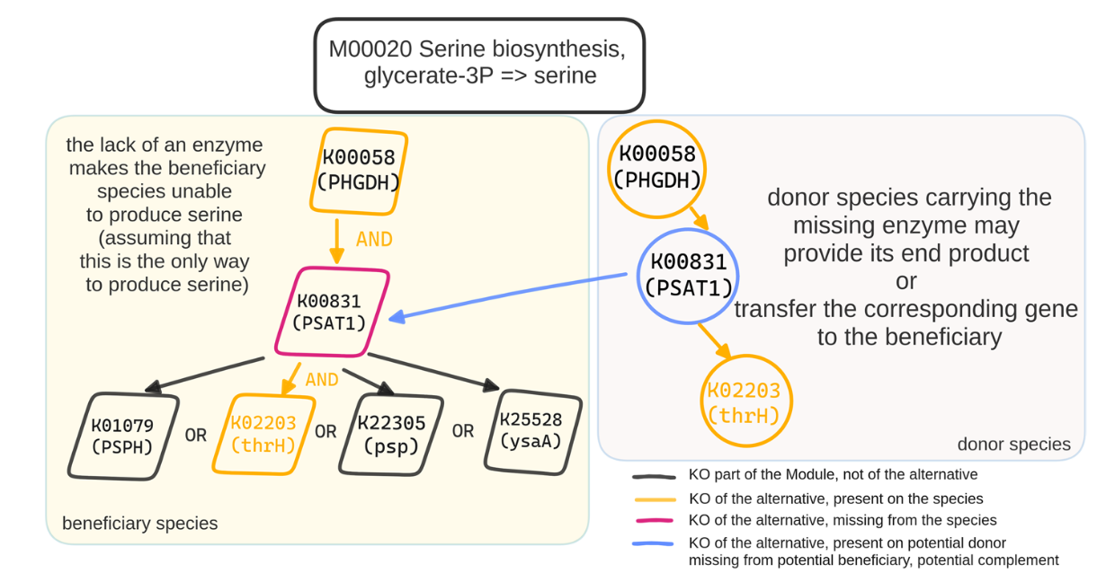 为了探究一个物种是否可能从伙伴物种中获益,将分析从网络层面提升至代谢途径层面,检查它们的途径是否互补是很有帮助的。为此,作者采用了一种简单的方法,基于一对物种的 KEGG 同源基因注释和 KEGG 模块数据库,枚举所有可能的互补关系。