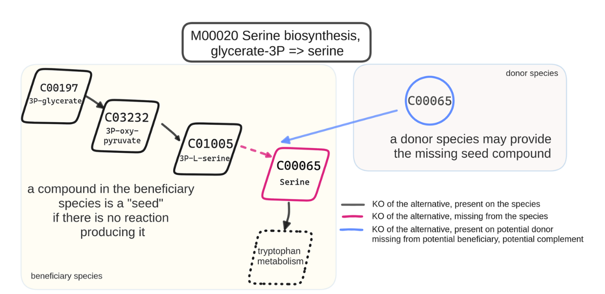 基于一个物种的种子集,已经提出了几种估计两个或多个物种之间代谢相互作用的指标。代谢互补性指数衡量两个微生物物种通过互补彼此生物合成能力而相互帮助的程度。如所述,它定义为物种A的种子化合物中可以被物种B的代谢网络合成的比例,即它们不是物种B的种子。作者将这个集合称为非种子集,它代表了代谢网络可以自行产生的化合物。代谢互补性指数提供了两个物种之间潜在交叉喂养相互作用的上限评估。种子可能是独立的,即它们不能由代谢网络中的任何其他生化反应产生,或者它们可以是相互依赖的,形成种子化合物组。因此,网络的每个强连通分量的大小可以用作化合物作为种子的置信度。代谢竞争指数定义为物种A的种子集与物种B的种子集的交集,经置信度加权和归一化后得到。代谢竞争指数代表两个物种营养谱的相似性。该指数建立了一个物种可能面临来自另一个物种的竞争水平的上限。这些指标已在NetCooperate和NetCmpt工具中分别描述和实现。作者将这两个指标称为“种子分数”。最近发布了PhyloMint工具,支持识别种子和非种子集,并能够随后计算SBML格式代谢网络的种子分数。