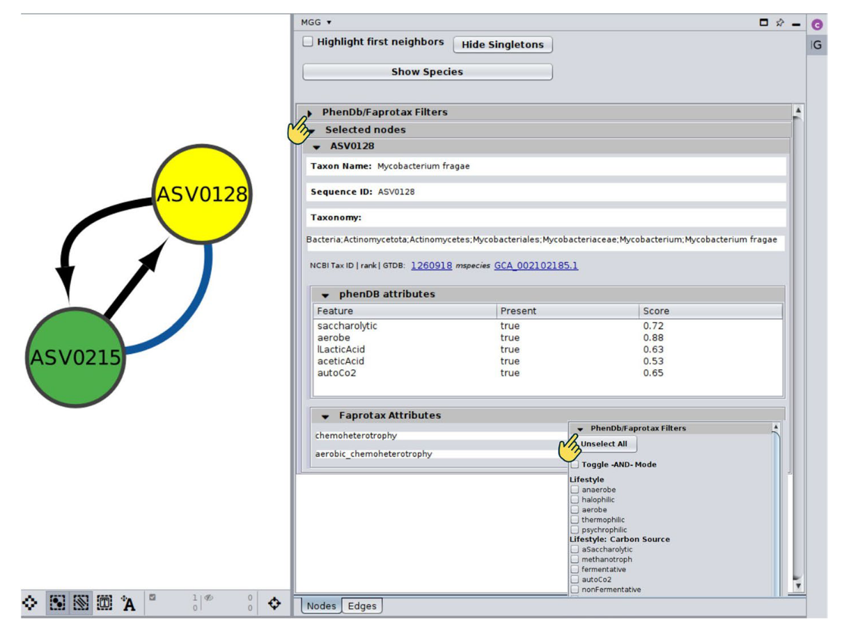 - 节点 CyPanel:当选择一个节点时,节点面板会显示其分类学信息、映射到的 NCBI 分类学 ID 和 GTDB 基因组(如果是在线分析)。根据可用注释,会显示基于基因组的表型性状预测和/或基于 FAPROTAX 的注释。面板顶部提供了一个“控制区”,用户可以根据表型性状组对节点进行过滤,例如显示携带一组性状中至少一个(OR)或全部(AND)的节点。