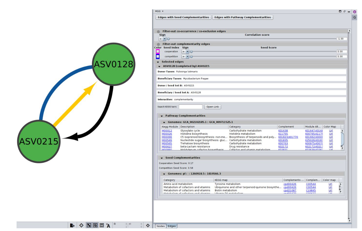 - 边 CyPanel:当选择一条边时,边面板会显示所涉及的两个分类单元的名称、序列 ID 和相互作用类型。对于互补性边,会为每种互补性类型提供子面板。对于途径互补性,会显示被互补的 KEGG 模块、其描述、所属代谢类别、与建议的交叉喂养化合物相关的 KO 列表,以及基于这些添加而完成的模块版本。同时提供一个链接,指向突出显示该模块的彩色 KEGG 图。对于种子互补性,同样会提供一个可折叠表格,显示类别类型和种子化合物相关的 KEGG 图,并列出来自供体的潜在交叉喂养种子化合物。也提供链接指向彩色 KEGG 图,图中会突出显示受益者的相关化合物和可能获取的种子。