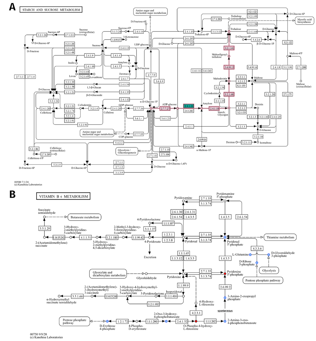 在microbetag框架中,使用源自高质量GTDB代表性基因组的代谢网络和PhyloMint工具计算种子分数。使用Model SEED管道通过其Python接口ModelSEEDpy重建代谢网络。后者需要RAST注释的基因组。如果可通过PATRIC数据库获得,则从PATRIC检索注释,否则,通过RASTtk执行RAST注释。由于PhyloMInt未考虑反应可逆性,因此采用了该工具的修改版用于microbetag。识别并存储了PATRIC注释基因组的种子和非种子集,以便microbetag的在线版本可以计算映射到用户数据集的所有基因组对的种子和非种子集之间的重叠。每个代谢网络的种子和非种子化合物被映射到它们相应的KO术语(作为其反应的底物或产物),并且那些与KEGG模块相关的化合物被进一步考虑。聚焦于KEGG模块相关的KO术语作为感兴趣的术语,检索物种A的种子集与物种B的非种子集的重叠。将两个分类单元都映射到至少一个GTDB基因组的微生物网络的边通过列出所有至少有一种种子化合物对受益物种有用的KEGG图谱进行进一步注释。