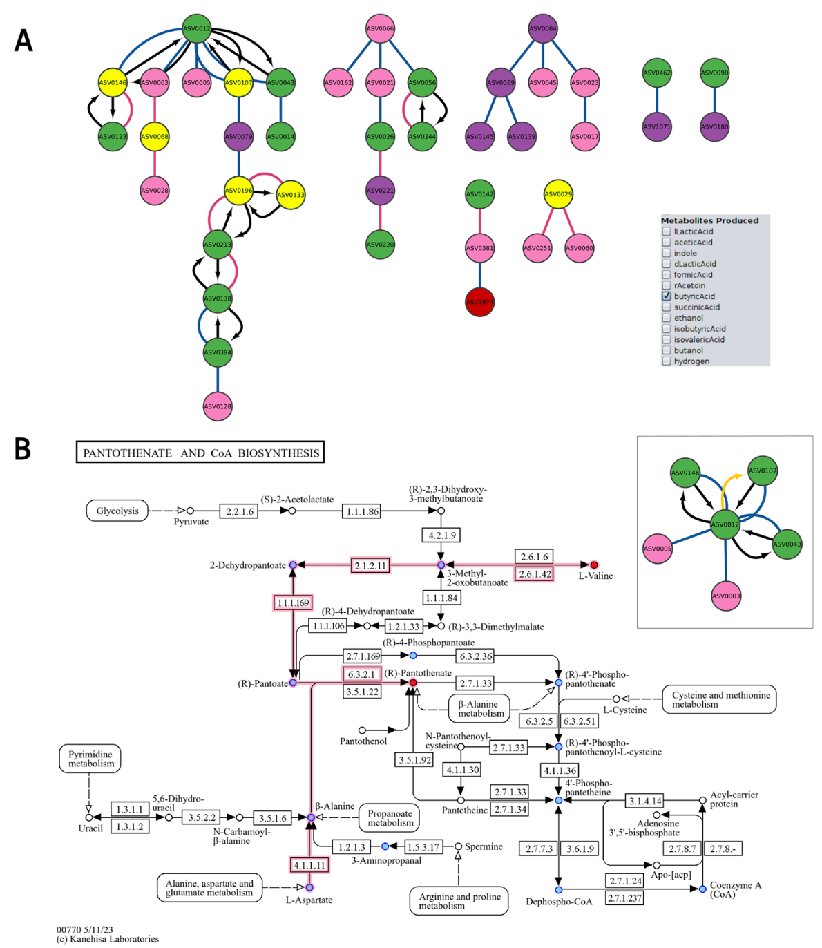 microbetag 预测了数个分类单元为丁酸盐生产者。有趣的是,大多数涉及丁酸盐生产者的关联是负相关的,这可能反映了它们代表了群落演替的不同阶段。同时,一个丁酸盐生产者 (Flavonifractor plautii; ASV0012) 具有多个正相关。microbetag 报告显示,F. plautii 与其邻居物种 Eggerthella lenta (ASV0107) 之间存在若干途径和种子互补性,特别是与辅酶 A 生物合成相关的互补性,而该过程参与了细菌丁酸盐生产途径。具体而言,F. plautii 需要外源获取泛酸盐,而 E. lenta 能够合成它。
