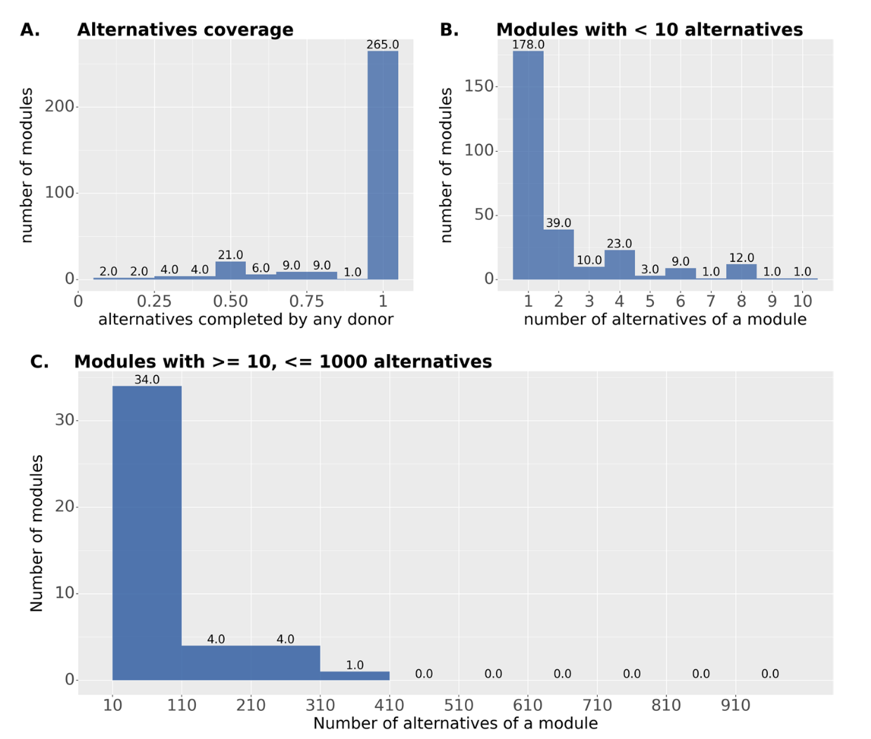 值得注意的是,近15%的互补性与糖酵解模块相关,这在意料之中,因为该模块拥有多达13,440个替代方案。然而,对于绝大多数模块,所有枚举出的替代方案都被发现可以由其他分类单元补足。此外,有3个KEGG模块的替代方案数量超过1000个。