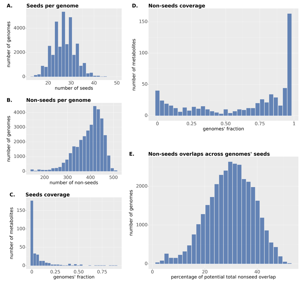 关于种子互补性,分析仅聚焦于与KEGG模块相关的代谢物,共涉及1432种ModelSEED化合物。其中,452种代谢物在至少一个基因组中被鉴定为种子化合物,而545种在至少一个基因组中作为非种子化合物出现。种子和非种子化合物数量的分布均呈现轻微的右偏态。平均每个基因组含有99个种子化合物和333个非种子化合物。大多数化合物只在少数基因组中作为种子存在,仅有81种化合物在超过50%的基因组中作为种子,而270种化合物可由超过75%的基因组自身合成。