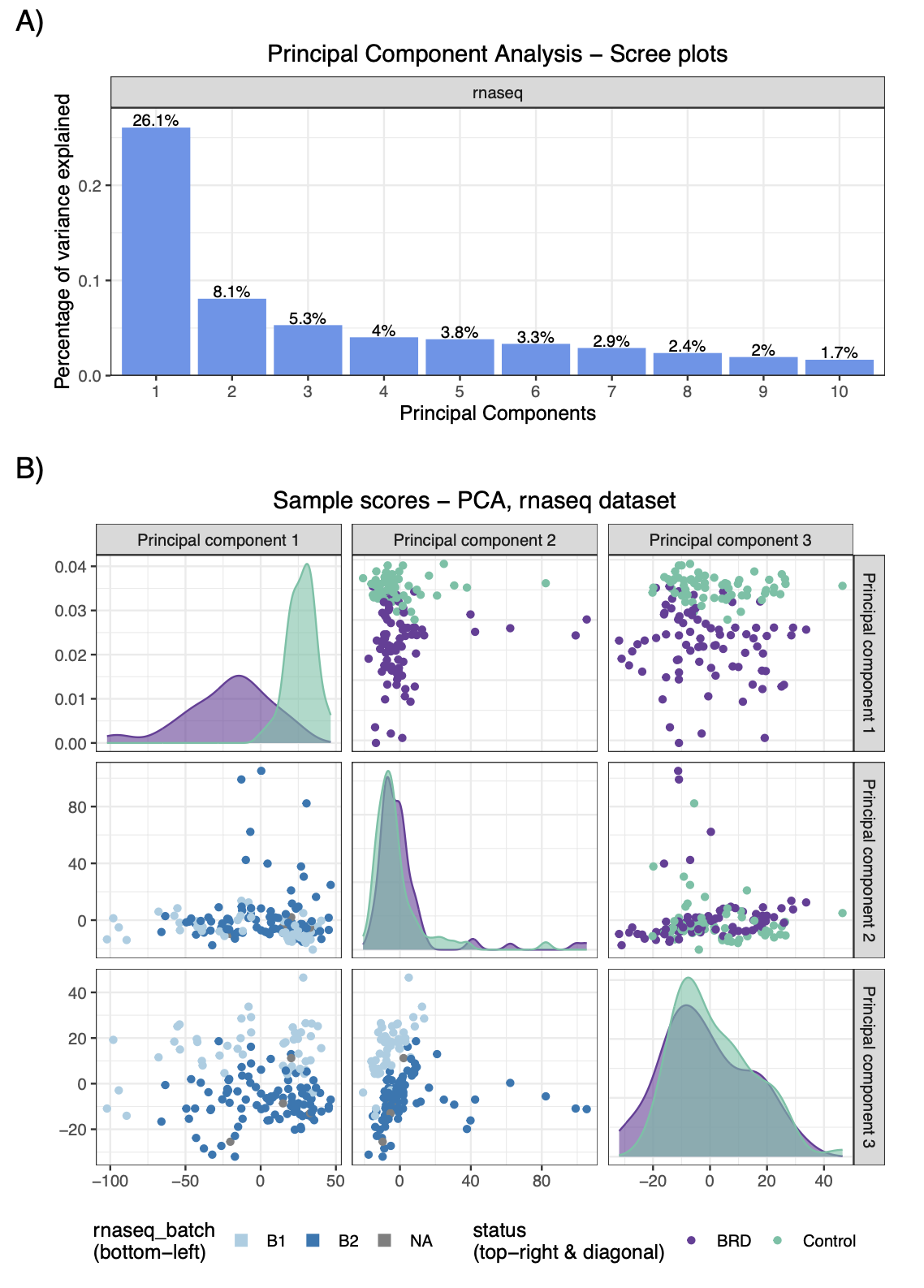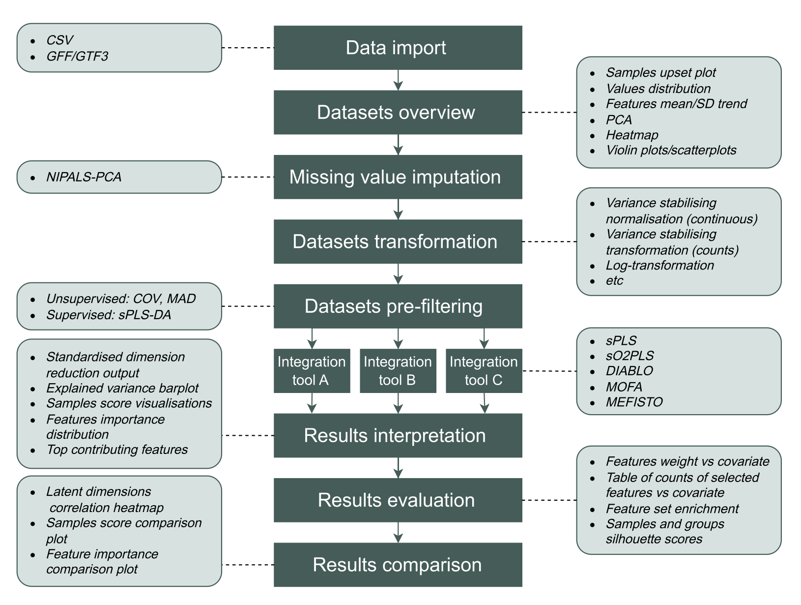该包提供了一系列可视化和诊断工具用于数据概览,例如评估缺失值比例、通过Upset图展示不同数据集间的样本重叠情况等。对于含有缺失值的数据集,可以使用非线性迭代偏最小二乘法主成分分析进行估算。此外,moiraine集成了多种数据转换方法,以满足不同类型数据的需求。在特征预过滤方面,支持基于中位数绝对偏差或变异系数的无监督方法,以及基于稀疏偏最小二乘判别分析的监督方法,以保留与特定样本结果最相关的特征。