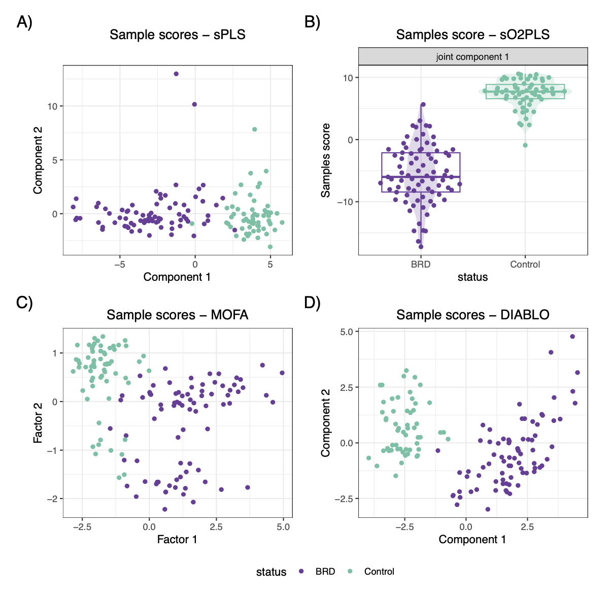 使用moiraine支持的四种方法(sPLS、sO2PLS、MOFA和DIABLO)分析了该多组学数据集。参数调优后,各方法构建的潜在维度数量分别为2、7、15和4个。所有方法构建的第一个(或前两个)潜在维度都能将感染样本与对照样本区分开。