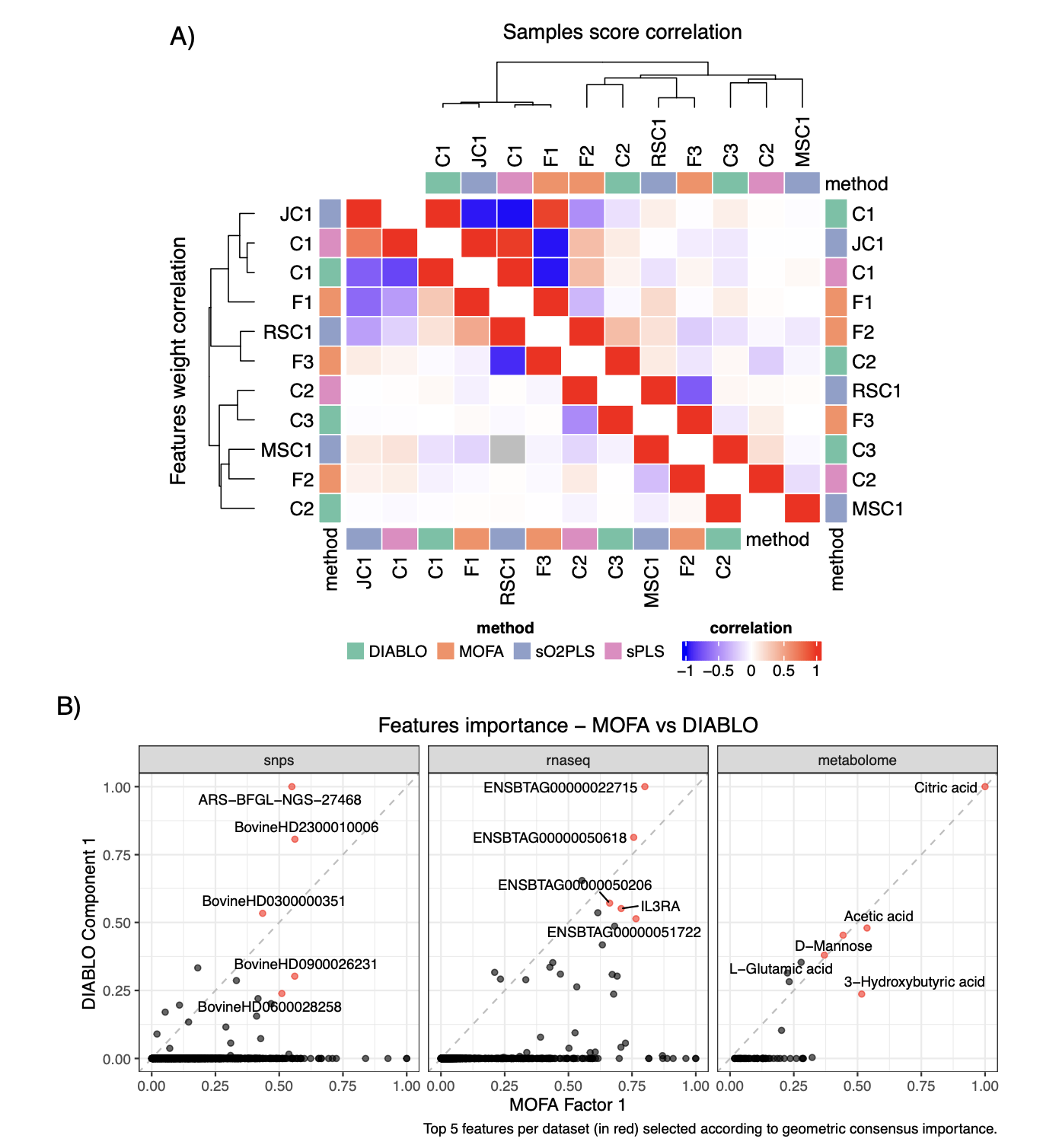 研究人员比较了不同方法构建的前几个潜在维度在样本得分和特征权重上的相关性。结果显示,各方法的第一个潜在维度在样本趋势上高度相似,但驱动这些趋势的特征排序并不完全一致,部分原因是方法本身进行的特征选择(除MOFA外)会将大多数特征的权重置零。此外,比较了MOFA和DIABLO对代谢组数据特征的重要性评分排序,发现二者高度一致(如柠檬酸、乙酸和D-甘露糖得分最高),但对某些SNP和转录本的评分存在差异,这反映了有监督(DIABLO)与无监督(MOFA)方法目标的不同。研究还比较了使用两种不同特征预过滤方法(监督式sPLS-DA vs. 无监督MAD筛选)后MOFA的结果,发现虽然前两个因子非常相似,但后续因子差异显著,这凸显了选择合适的预处理方法对集成结果的重大影响。