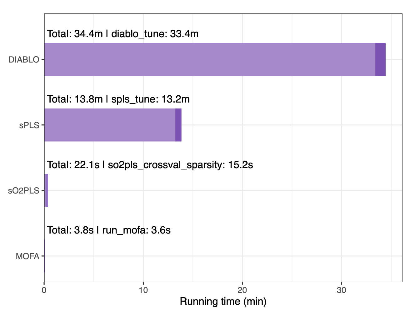 整个分析管道在具有4个CPU和16.4GB内存的系统上运行了约2.2小时。最耗时的步骤是sPLS-DA进行特征预过滤以及DIABLO和sPLS的交叉验证调参。特征预过滤是资源最密集的步骤之一,但强烈推荐在集成前执行,因为它不仅能减少后续步骤的计算负担,还能通过降低数据噪声和不平衡性来改善集成结果并降低过拟合风险。在不同集成工具中,DIABLO最慢(主要耗时于交叉验证),而sO2PLS和MOFA则非常快(均小于1分钟)。