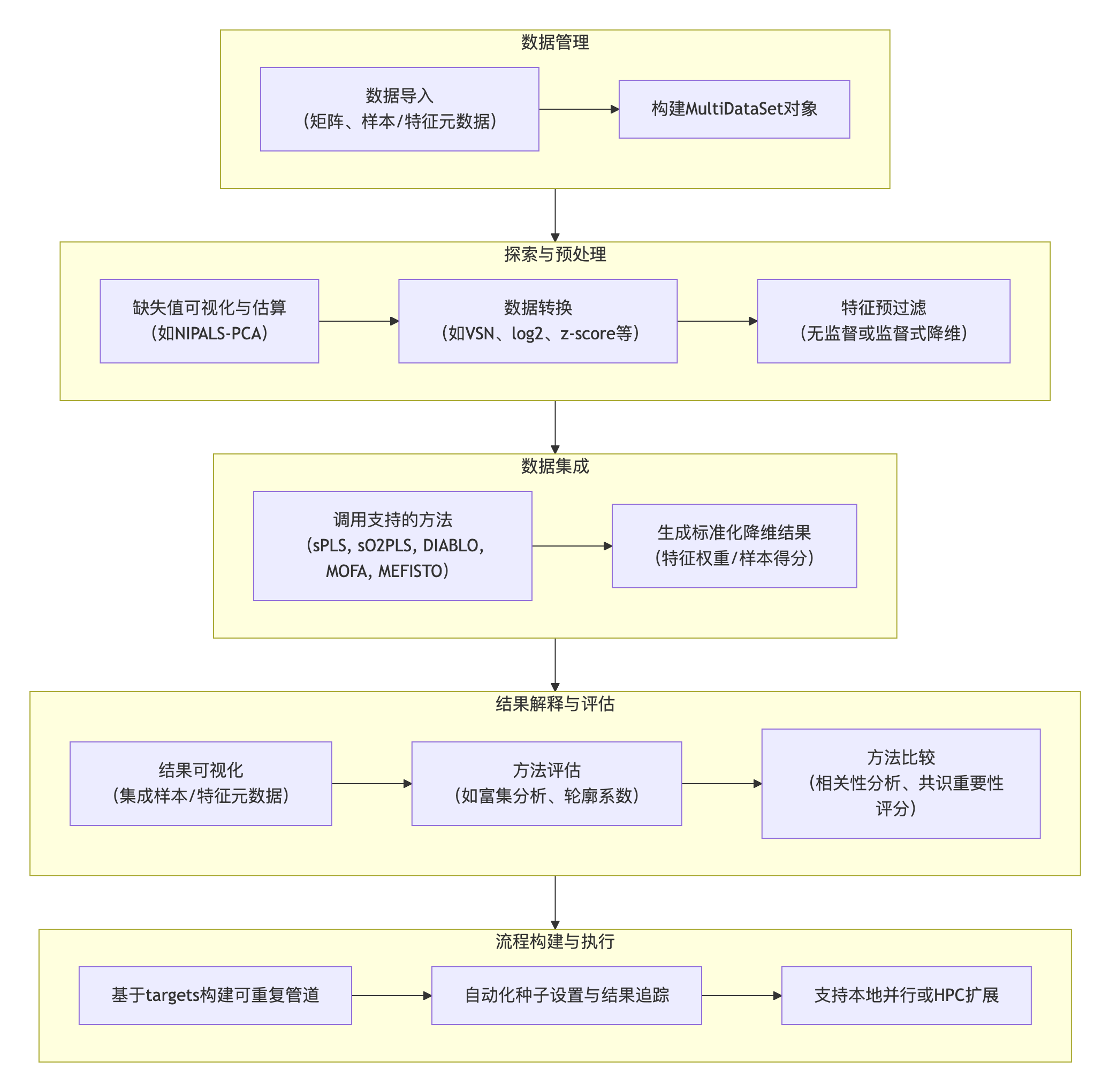moiraine包的功能涵盖了多组学集成分析的典型步骤,包括数据导入、探索与预处理、集成、结果解释与比较。其核心流程与功能架构如下: