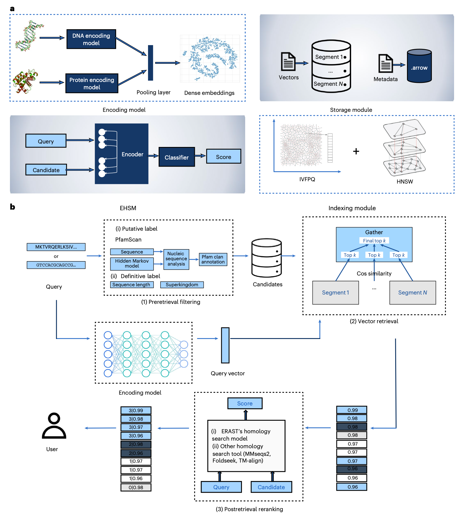 检索后重排序。在生物信息学中,准确搜索同源生物序列,特别是具有远距离进化关系的序列,仍是一个持续挑战。过去的研究常常侧重于增强编码模型,但当应用于向量数据库时,每次编码器模型更新都需要对数千万条序列进行重新编码,这会带来巨大的开销。在本研究中,作者对检索到的候选序列进行重排序,优先排列最相关的序列,以提升同源生物序列的搜索质量。为了重排序检索到的候选序列,作者设计了一个名为ERAST同源性搜索模型(EHSM)的评分模型,用于评估查询与目标序列的关系,并根据其分数对它们重新排序。此外,重排序模块被设计为可插拔的,允许灵活集成。ERAST支持多种高效的重排序策略以提升精度。具体而言,除了EHSM,ERAST还支持其他同源性搜索方法,如MMseqs2和TM-Align,为用户提供多样化的检索后重排序选择。